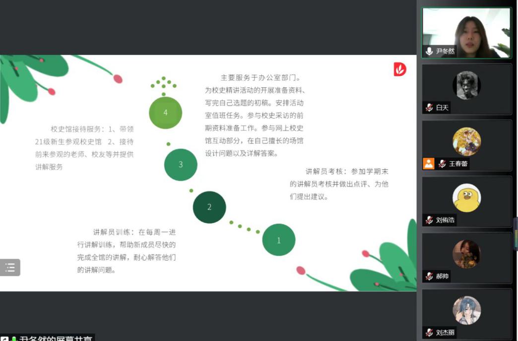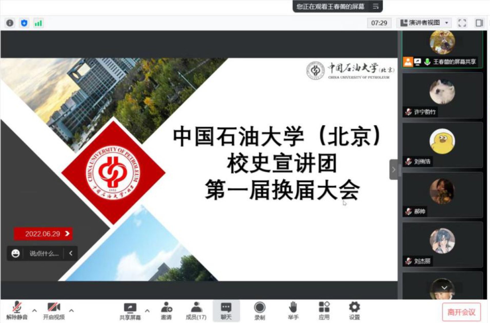 为进一步做好校园文化宣传工作,增强学生社团的凝聚力和向心力,6月29日下午,中国天天色天天(北京)校史宣讲团通过腾讯会议线上举行第一届换届大会。图书馆直属党支部书记兼副馆长、档案馆馆长海凤,社团指导教师毕然、张赢今,社团第一届主席团成员、第二届各部门部长候选学生参加了会议。