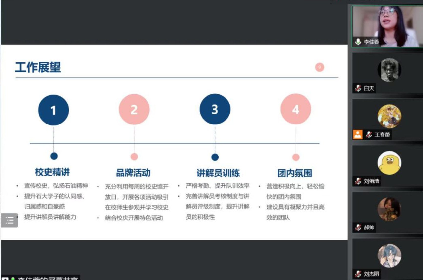 海凤围绕关键词“热爱”“创新”“传承”“收获”讲述了校史宣讲团的自身定位、成长目标以及在校园文化建设中应发挥的作用,希望校史宣讲团的青年学生加强社团组织管理,提高社团凝聚力,工作中开拓创新,在打造品牌活动、讲述校史故事、传承石油精神中不断历练成长。