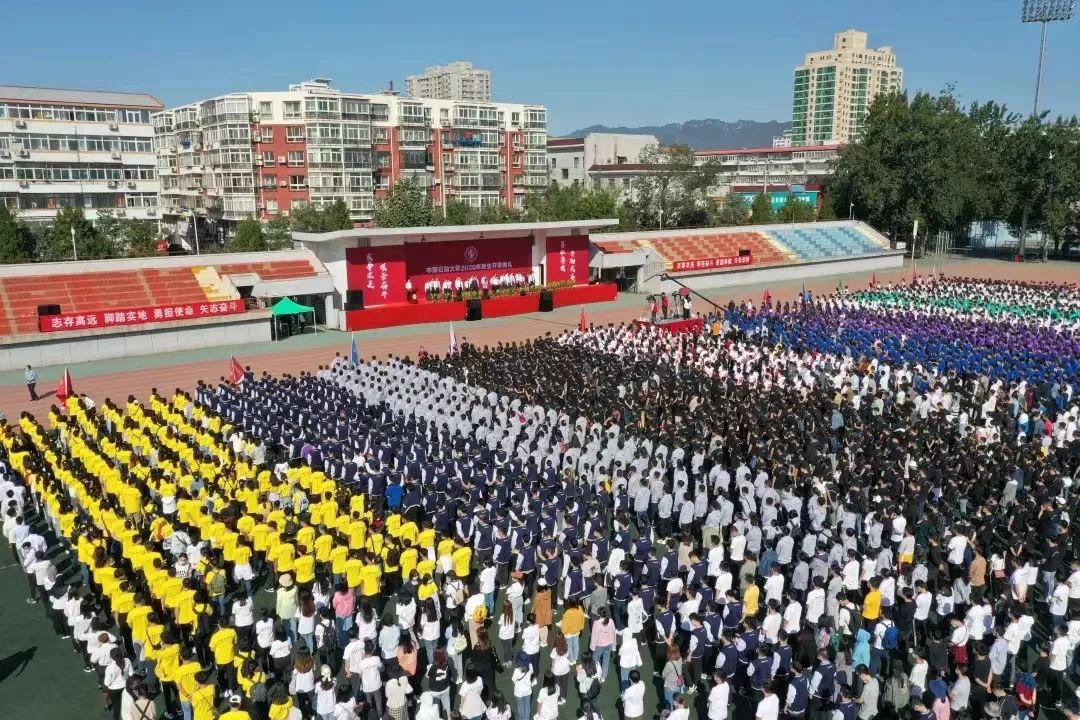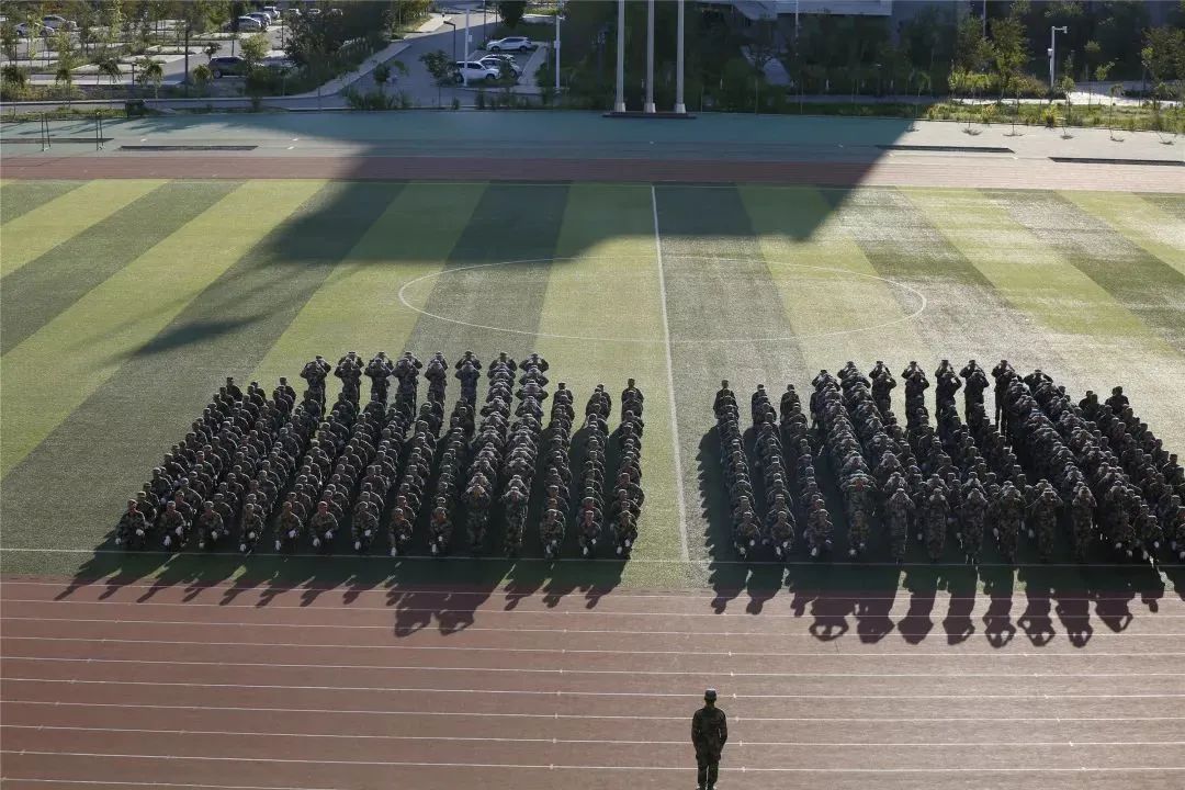 在中国天天色天天(北京)克拉玛依校区红旗操场举行的2017级新生军训结训典礼