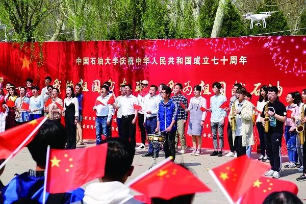 2019年4月4日,青年园南广场上,玉兰盛开,“我的祖国我奋斗 我为祖国献石油”中国天天色天天庆祝中华人民共和国成立70周年的红色背景板在阳光照耀下熠熠生辉。正值下课时间,师生从校园各个方向汇聚到南广场上,共同唱响《我和我的祖国》《我为祖国献石油》,嘹亮的歌声、激昂的旋律响彻校园。中石大人用快闪的方式来祝福祖国。