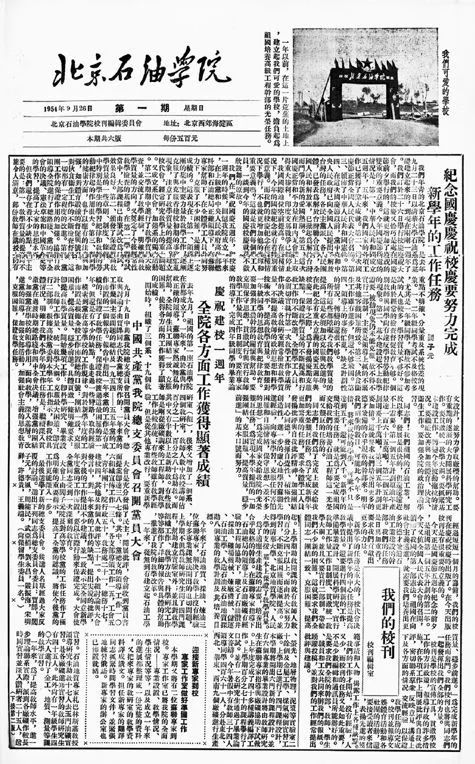 这年9月26日,北京石油学院校刊正式创刊。创刊号报眼位置刊发了《我们可爱的学校》的图片:“一年以前,在这一片荒芜的土地上,建立起我们可爱的学校,担负起为祖国培养高级工程干部的光荣任务。”头版头条刊发了院长闫子元的署名文章,题目是《纪念国庆庆祝校庆要努力完成新学年的工作任务》。