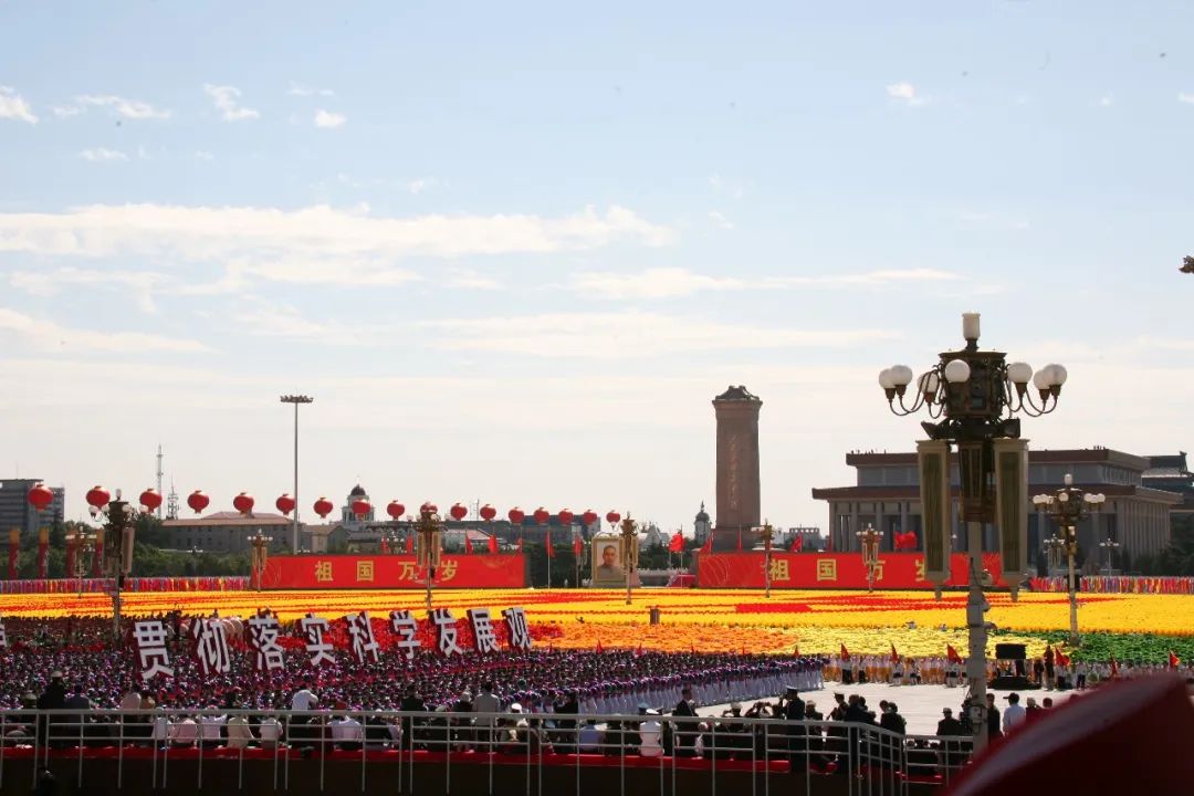“入场时广场上正巧播放着熟悉的《我为祖国献石油》那动人的旋律,激动得我们这些石油学子更振奋不已。我校的场地被安排在高校联欢区中属于极佳的位置:位于国旗左侧,正对着天安门城楼,后面巍然屹立着人民英雄纪念碑。站在那里,洋溢着喜庆气氛的广场美景尽收眼底。