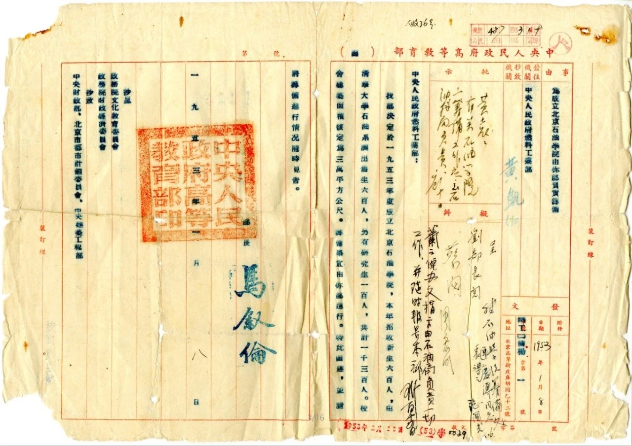 “1953年9月,在教学、基建、生活保障等筹建工作成功,初步具备开学上课条件的基础上,石油管理总局发出《京办53字第12472号通知》,《通知》中写道:‘北京石油学院于10月1日正式成立’ 。随即,9月23至25日清华大学石油工程系全体师生员工以及图书仪器设备等迁入北京石油学院校址。