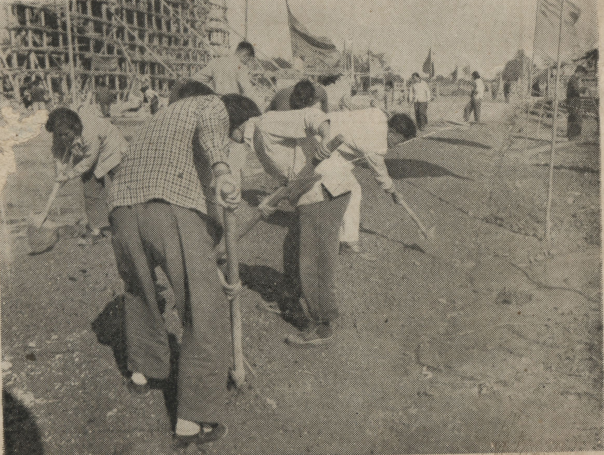 全院师生员工发扬主人翁精神,在努力学习的同时积极参加建校劳动。“露天上课不分心,住着工棚不怕苦;只学文化不满足,业余劳动来弥补;主楼建设送过砖,教学工地抬过土;红旗操场铺过道,青年园里种过树。”这是20世纪50年代和60年代师生投身建校劳动的生动写照。新校舍到处都洒有同学们的汗水。他们把自己的劳动果实命名为“建校大道”“劳动广场”“先锋球场”等。经过大家的辛勤劳动,不到一年,北京石油学院呈现出一种新的面貌。