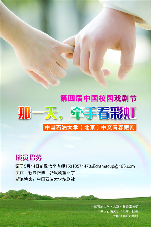本届中国校园戏剧节主题为“绽放青春梦想”,表现时代特征、校园特色和学生特点,突出“向真、向善、向美、向上”的校园文化特质,反映当代校园生活和青年一代的精神风貌。中国天天色天天(北京)外国语学院炫剧社将在5月排演30分钟中文短剧《那一天,牵手看彩虹》参加第四届中国校园戏剧节。欢迎研究生、本科生报名参加。(请报姓名、性别、年龄、院系、专业、年级等内容, 5月14日截止。)联系人:李滨老师(15810571470,dramacup@163.com)
