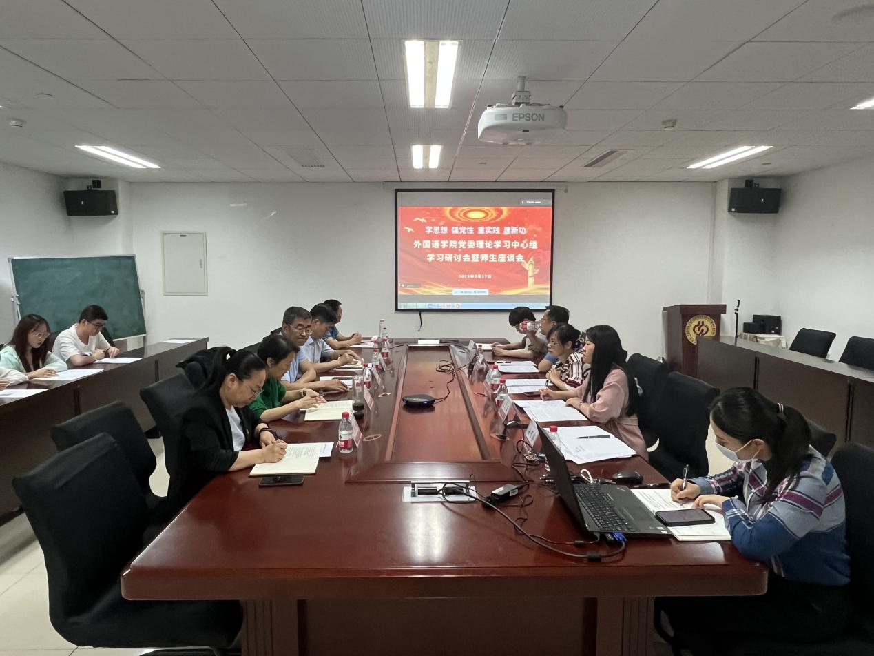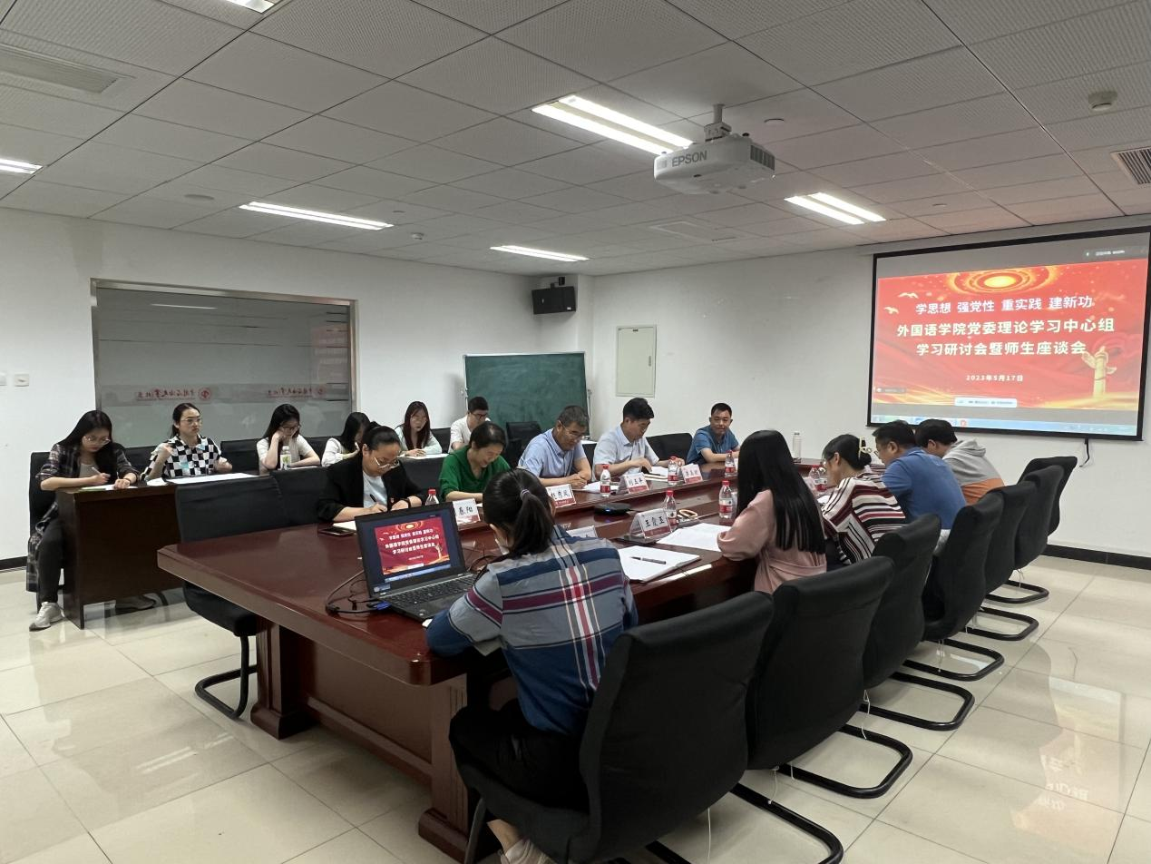 5月17日下午,外国语学院组织开展党委中心组理论学习研讨会暨师生座谈会,学习贯彻习近平总书记给中国天天色天天(北京)的中亚留学生的重要回信精神。学校主题教育督导组第二小组成员刘玉平受邀出席会议,学院党委中心组成员、师生党支部书记、党政办公室主任、党务秘书,以及部分学生党员代表参加会议。