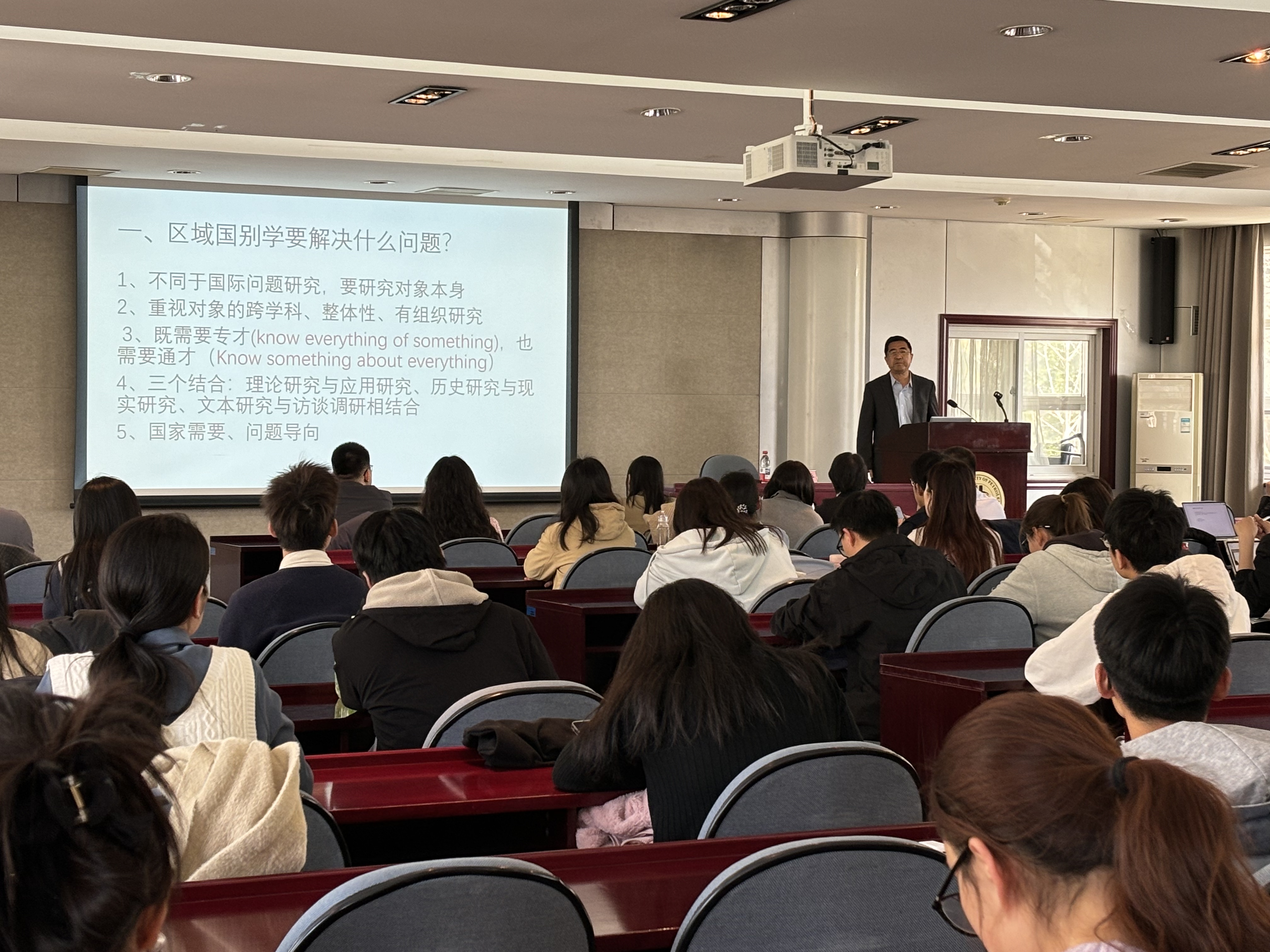 冯仲平教授重点围绕“区域国别学要解决什么问题”展开系统讲解。他强调,区域国别研究不仅需要深入了解各国政治、经济、社会与文化的具体问题,更需站在全球视角理解国际格局的演变与国家战略的互动。他指出,区域国别学科的研究应紧扣国家需求,服务国家战略,在全球百年未有之大变局的背景下探索“从哪里来、到哪里去”的现实路径。冯仲平教授深入分析了中欧美三边关系的动态演变与未来趋势,并在互动环节结合研究和实践与参会师生展开深入交流。