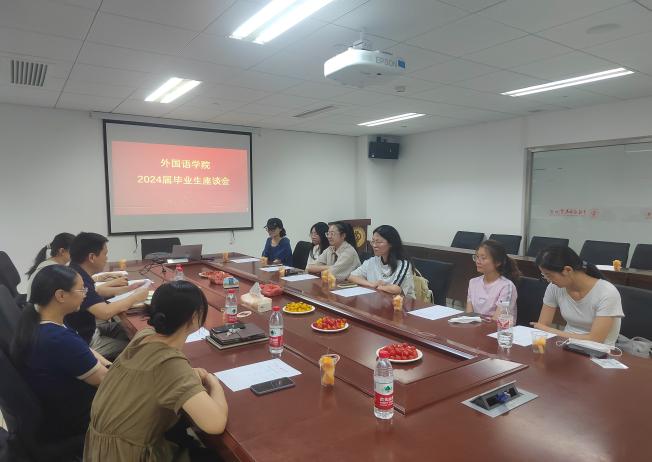 6月27日,外国语学院于主楼A724会议室召开2024届毕业生座谈会。外国语学院党委书记周玉成、党委副书记刘春阳、副院长崔亚霄、研究生毕业班辅导员谌丛、本科生毕业班辅导员王芃月及本研毕业生代表参加会议。