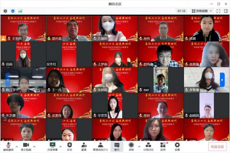 喜迎二十大,奋进新时代。为深入学习党和国家近年来取得的历史性成就,振奋精神、凝聚力量,以更加昂扬奋进的精神状态谱写学校事业发展新篇章,以实际行动迎接党的二十大胜利召开,外国语学院英语系党支部、2021级语言学党支部与外语本科生党支部于2022年10月6日开展师生联学共建活动。本次活动以“喜迎二十大,奋进新时代”为主题,回顾了我国经济社会、高等教育以及学校的发展的建设性成就,加强了支部间学习交流,激发支部活力,同时增进了师生情谊,提升了党组织的向心力和凝聚力。本次活动由郑世高主持。