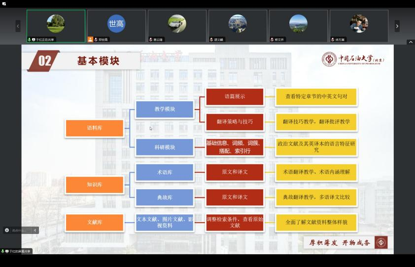 于红从《习近平谈治国理政》多语种数据库的基本情况出发,对数据库建设背景、收录语种、数据库结构等做了介绍,并对“如何检索数据库、如何利用数据库进行教学”等数据库作为教学与科研平台的操作细节作了重点指导,同时结合自身教学实践分享了多例利用数据库进行教学的案例。