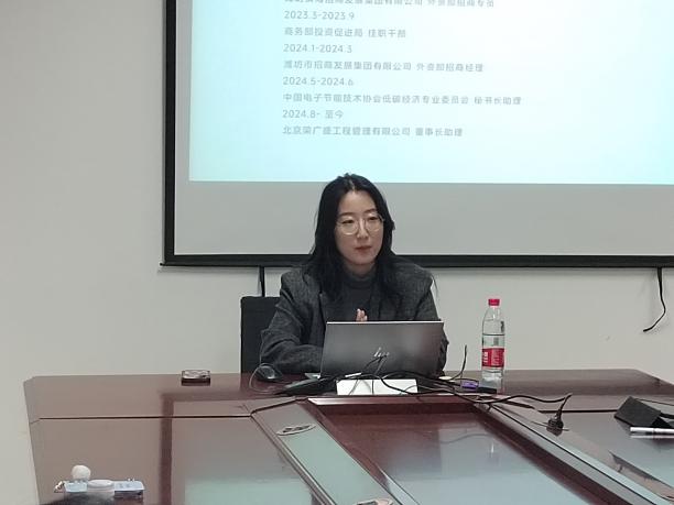 李家秀现任北京荣广盛工程管理有限公司董事长助理,曾在潍坊市招商集团、中国电子节能技术协会任职。她从自身经历出发,指出实习是大学生积累工作经验和明晰个人职业发展方向的重要途径,她鼓励学生充分利用实习群、校园海报等学校提供的资源,及时获取最新招聘信息,同时抓住校招机会,积极投递简历、增加面试机会、积累实践经验,以提高应变能力和沟通技巧,同时清晰认识自我,明确未来职业方向。李家秀在互动环节中,针对学生提出的问题分享了自己在求职过程中遇到的问题,并提出了解决办法。