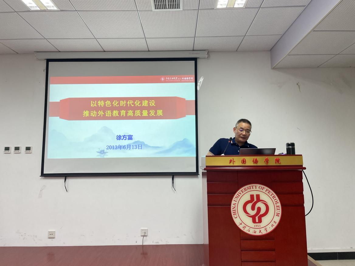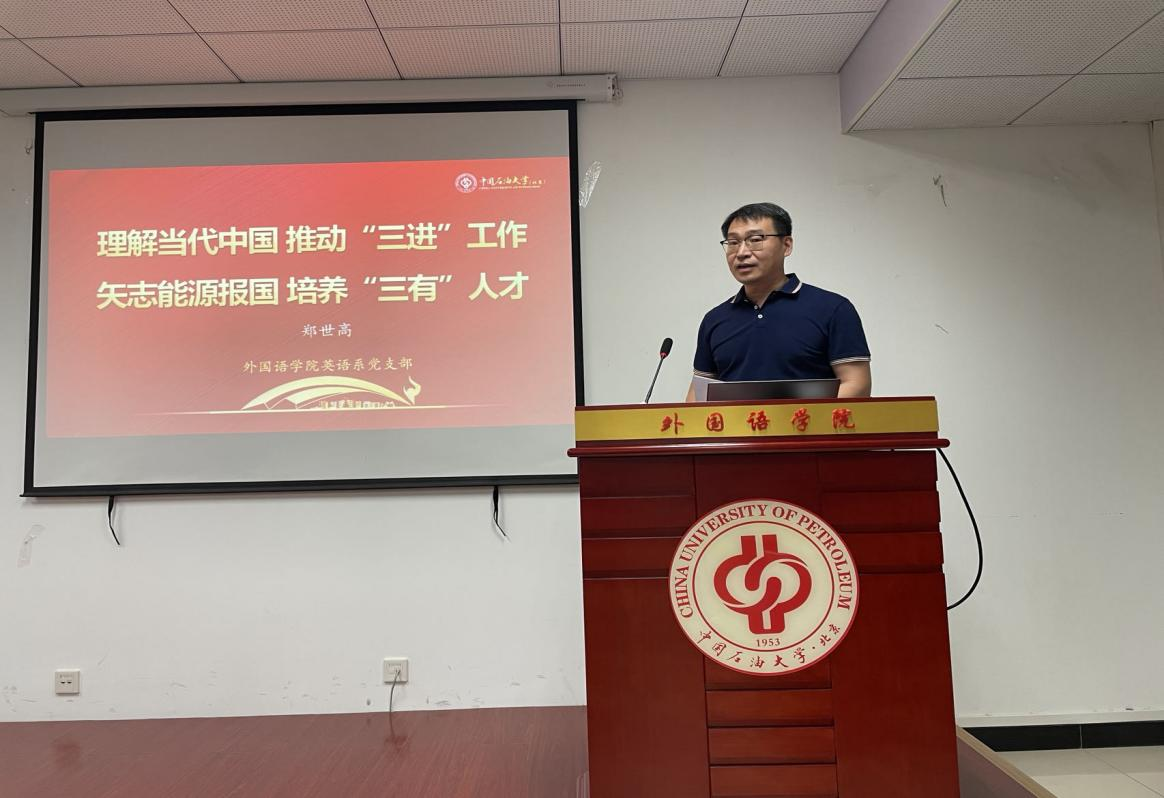 郑世高以“理解当代中国 推进‘三进’工作;矢志能源报国 培养‘三有’人才”为题,从第二次鸦片战争中“port”一词的理解和翻译引入话题,全面总结了外国语学院在推动“三进”工作和培养“三有”人才方面形成的特色、路径,以及取得的成绩。