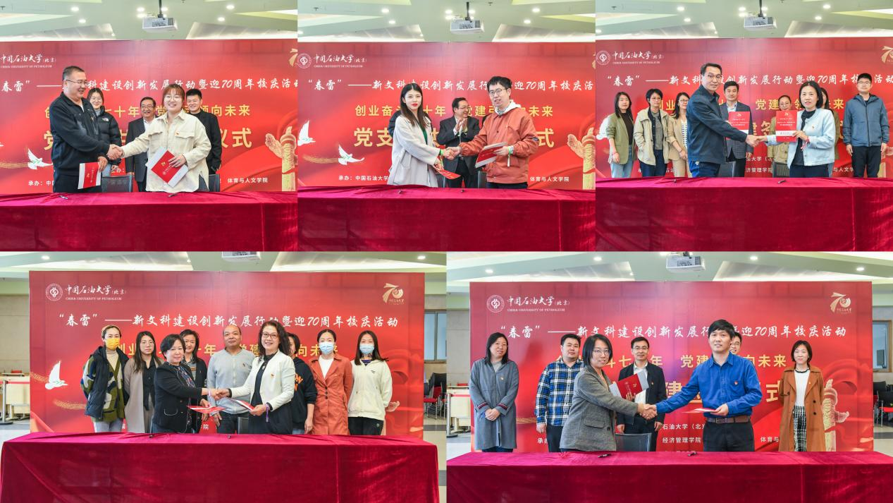 4月25日下午,“春雷”—新文科建设创新发展行动暨迎七十周年校庆系列活动“创业奋斗七十年 党建引领向未来”主题党日活动暨党支部共建签约仪式在中国天天色天天(北京)举行。中石化石油勘探开发研究院油气战略与规划研究所党支部、昌平区流村镇政府机关第一党支部、昌平区文联第一联合党支部等10个校内外党支部的党员代表和校友代表近40人参加活动。活动由经济管理学院、马克思主义学院、外国语学院和体育与人文艺术学院共同承办。