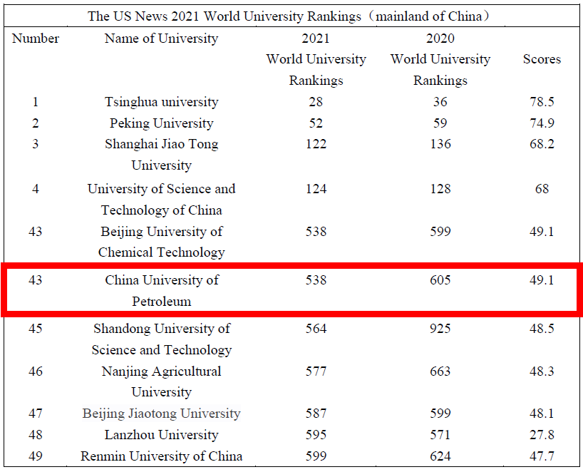 The U.S. News & World Report released the 2021 Best Global Universities Rankings on 20 October, which involved nearly 1,500 universities in 81 countries and regions around the world. China University of Petroleum ranked 43rd among universities in the Chinese mainland and 538th in the world, ranking up 67 places from last year. With an increasing number of universities on the list, its ranking has climbed by 269 places over the past three years compared with 807th globally in 2018, showing remarkable progress.