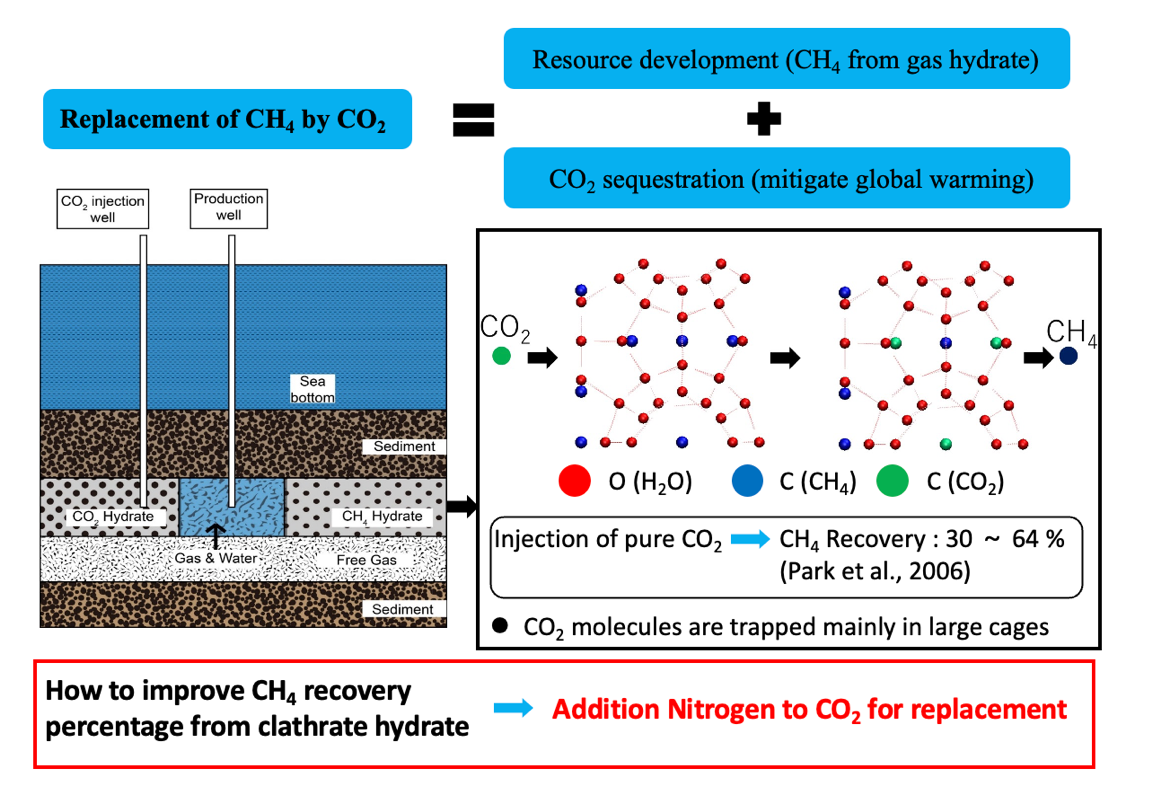 三、天然气水合物:研究水合物晶格内部的气体分子种类、气体分子占有率对水合物力学性质的影响、以及利用CO2置换法开采水合物中甲烷气体的促进剂等。