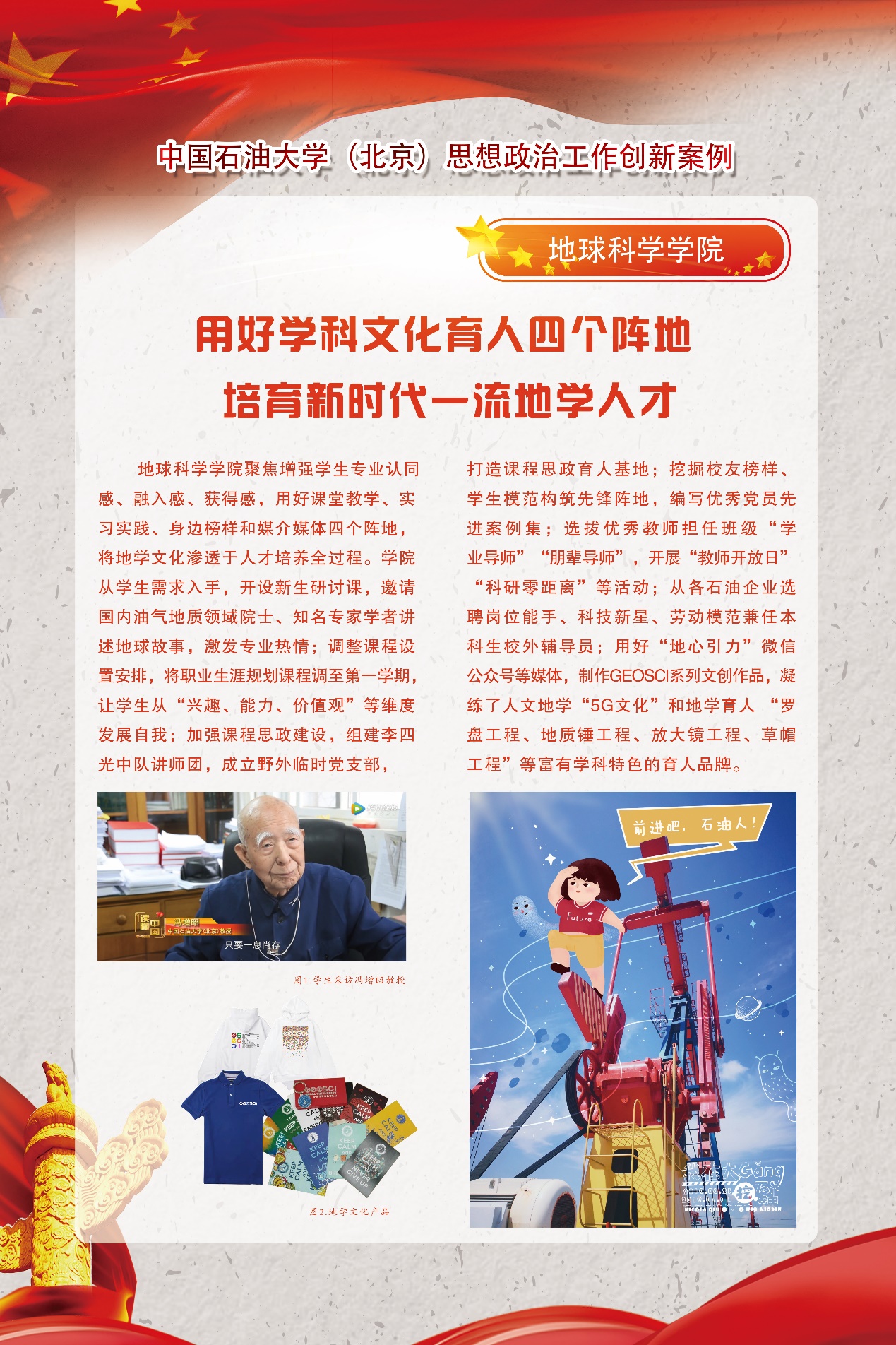 此外,学院聚焦增强学生专业认同感、融入感、获得感,用好课堂教学、实习实践、身边榜样和媒介媒体四个阵地,将地学文化渗透于人才培养全过程。学院从学生需求入手,开设新生研讨课,邀请国内油气地质领域院士、知名专家学生讲述地球故事,激发专业热情;调整课程设计安排,将职业生涯规划课程调至第一学期,让学生从“兴趣、能力、价值观”等维度发展自我;加强课程思政建设,组建李四光中队讲师团,成立野外临时党支部,打造课程思政育人基地;挖掘校友榜样、学生模范构筑先锋阵地,编写优秀房源先进案例集;选拔优秀教师担任“学业导师”“朋辈导师”,开展“教师开放日”“科研零距离”等活动;从各石油企业选聘岗位能手、科技新星、劳动模范兼任本科生校外辅导员;用好“地心引力”微信公众号等媒体,制作GEOSCI系列文创作品,凝炼了人文地学“5G文化”和地学育人“罗盘工作、地质锤工程、放大镜工程、草帽工程”等富有学科特色的育人品牌。