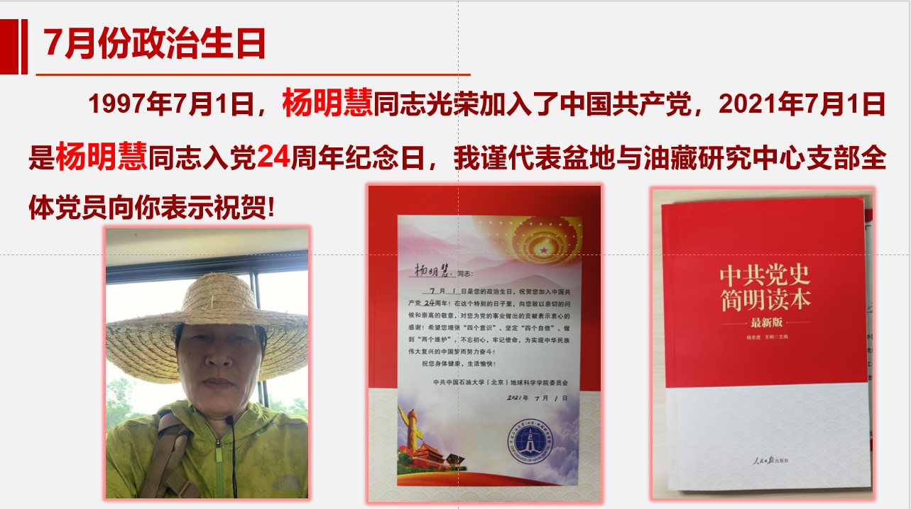 支部书记刘小平介绍了7月份学习要点,回顾了习近平总书记在庆祝中国共产党成立100周年大会上的重要讲话,强调了学习的必要性。学习分为四个部分:首先,刘小平系统汇报了2021年上半年支部工作情况,并对如何做好下步工作做了详尽的规划;其次,围绕“聆听习近平总书记在100周年大会上的重要讲话情况有什么心得体会”、“学习习近平新时代中国特色社会主义思想和党中央指定学习材料有什么感悟”、“对照党史学习教育目标要求中自身还存在哪些差距和不足”、“如何立足岗位、履职尽责发挥党员先锋模范作用”这四个方面,所有党员同志逐一发言,开展了自我批评。其中,刘小平首先带头展开了批评与自我批评,认为我们应该发挥共产党人的优良传统,吃水不忘挖井人,在做好自身本质工作的同时,要多加入到为身边群众做实事好事的工作中去,并介绍了支部朱雷同志积极参加社区工作为身边群众做好事的事例,鼓励同志们向朱雷学习;随后朱雷同志详细分享了为身边群众做好事的心路历程;朱传庆认为,学党史不是任务,更不是家庭作业,我们需要将党史学习融入到日常生活中,用心感悟才能领会精要;向才富认为我们处于和平盛世,应该努力将自身融入到国家建设中,在搞好科研工作的同时,更要为石油工业培养优秀人才。随后,刘小平主持为杨明慧、邱楠生、王洪玉3名党员过政治生日,并赠送了政治生日贺卡及生日礼物,最后,所有党员重温了入党誓词,进一步强化了政治仪式感。