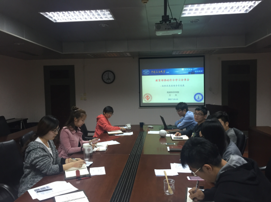 2017年10月11日下午,地球科学学院辅导员业务培训会在地质楼1105举行,我院党委副书记周学智及团委书记费葳葳带领全体辅导员集体学习了中华人民共和国教育部令第43号(即《普通高等学校辅导员队伍建设规定》)的主要思想和具体内容。专职辅导员王天老师任会议主讲。