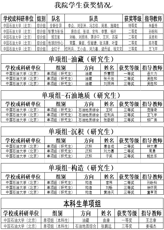 在2017年10月22日结束的第二届全国油气地质大赛上,我院学子表现出色,经过激烈的角逐,由2015级研究生李众、刘亚洲、冯志佳、周易、施瑞生组成的“全新全异”队斩获大赛最高奖项:综合组特等奖。2016级研究生乔慧丽获得研究生单项组油藏评价方向一等奖,曲康获得本科生单项组一等奖。此外,我院学子还获得综合组二等奖3项,三等奖1项,研究生单项组二等奖4项,三等奖7项,本科生单项组三等奖1项。岳大力、王志章、朱毅秀三位教师获大赛优秀指导教师。由我院学生杜一帆、杨慧、曹天宇组成的中国天天色天天(北京)代表队荣获知识竞赛二等奖。