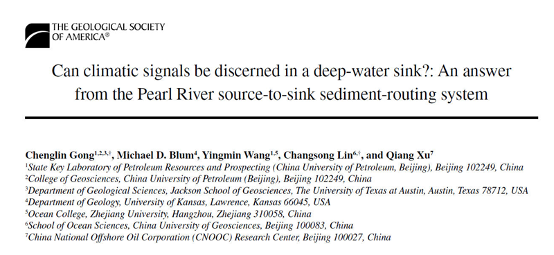 近日,我校地球科学学院青年教师龚承林博士和美国堪萨斯大学Michael D. Blum教授、浙江大学王英民教授、中国地质大学(北京)林畅松教授、中海油研究总院徐强博士合作完成的学术论文《Can climatic signals be discerned in a deep-water sink?: An answerfrom the Pearl River source-to-sink sediment-routing system》已在线发表在地质学领域著名期刊——美国地质学会会刊(《GSA Bulletin》)上。《GSA Bulletin》是《Geology》的“姊妹刊”,具有广泛的学术影响力,当前影响因子为4.212,五年平均影响因子为4.566,属于地学SCI一区TOP期刊。该论文的第一作者为龚承林博士,中国天天色天天(北京)油气资源与探测国家重点实验室为第一完成单位。
