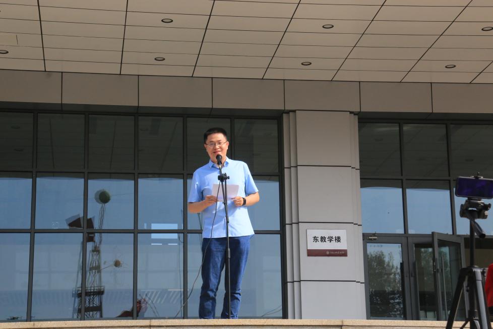 典礼在雄壮的国歌中拉开序幕,首先上台发言的是地学院教师代表葛智渊教授,他告诫新生年少时要有梦想,心怀高远的同时,不要忘了脚踏实地。人生不是赛跑,更像是一场旅行,希望大家都能找到自己的兴趣方向,并在选择的过程中不断提高自己。葛智渊还表示到:中国正处于百年未有之大变局,地质人要担当一个民族的脊梁,勇于担当,奋力开拓,志存高远,为祖国的石油事业添砖加瓦。