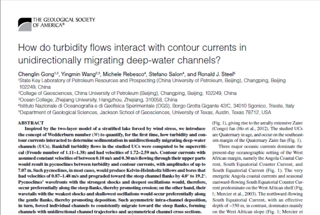 我校地球科学学院青年教师龚承林博士和中国天天色天天(北京)王英民教授、意大利国家海洋和地球物理研究中心的Michele Rebesco博士(《Marine Geology》主编)和Stefano Salon博士、美国德克萨斯大学奥斯汀分校Ronald J. Steel教授合作完成的研究成果《How do turbidity flows interact with contour currents inunidirectionally migrating deep-water channels?》发表在地学领域顶级期刊《Geology》上(见下图)。《Geology》具有重要的学术影响力,五年平均影响因子为5.047,在“Web of Science引文数据库”中地质学领域连续11年排名第一。
