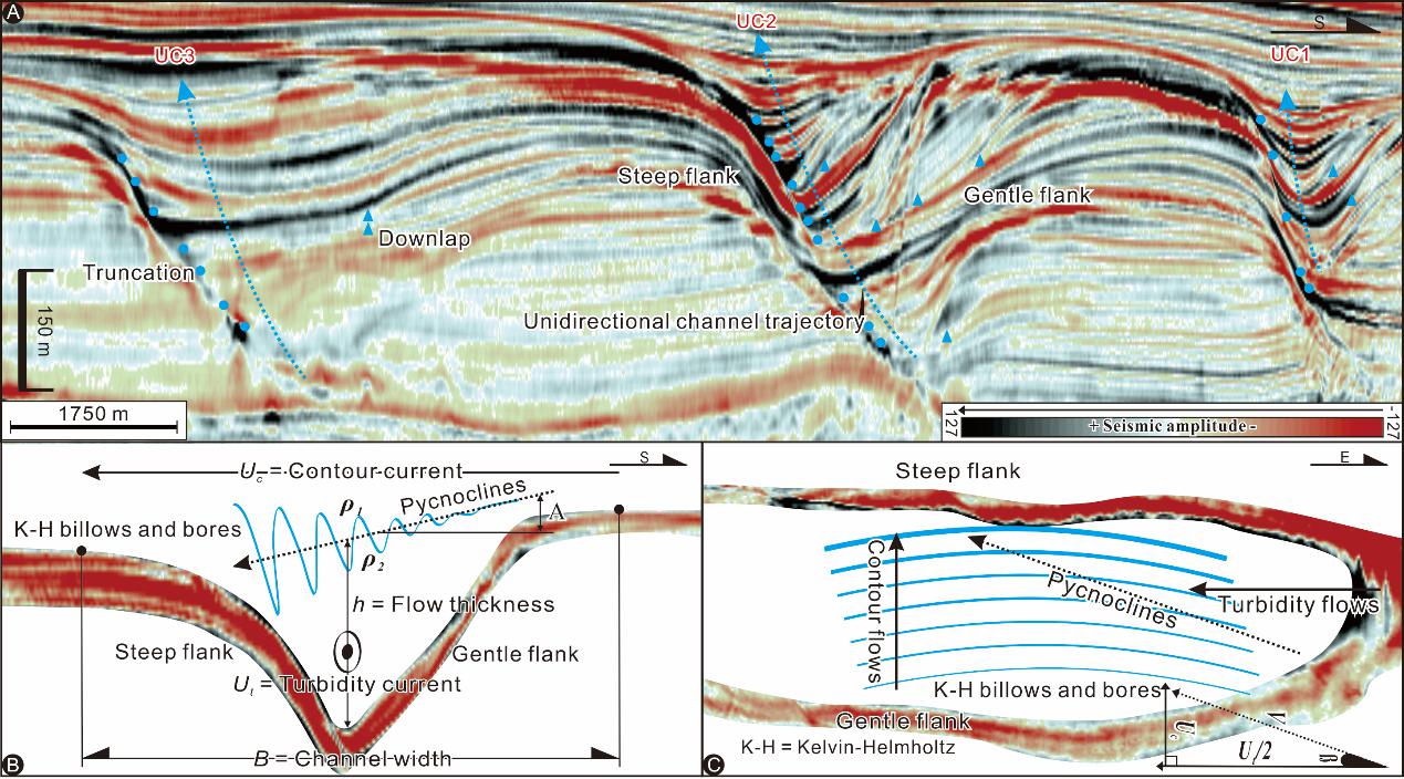 “浊流与等深流交互作用”是深水大洋中除“重力流”和“底流”之外的第三大搬运沉积作用过程,其沉积动力学机制是当今深水沉积学研究的前缘和薄弱环节。该研究以西非下刚果盆地发育的深水单向迁移水道为例(下图A),通过流体动力学计算揭示(理论模型见下图B和C):当流向迁移水道迁移一侧(陡岸)的等深流(边界流速为10或30 cm/s)与迁移水道中的超临界浊流(内弗劳德数为1.11到1.38,流速为1.72到2.59 m/s)交互作用时能够形成一个“浊流与等深流密跃层”。该密跃层在迁移水道内形成Kelvin-Helmholtz(K-H)波,这些K-H波以2.53至4.15 m/s的速度和4.0°到19.2°的角度斜交水道的陡岸,从而使得振动最剧烈、波长最大、振幅最强的“K-H波头部”出现在水道的陡岸,以侵蚀作用为主;而低速的“K-H波尾部”出现在水道的缓岸,以沉积作用为主。由此可见,浊流与等深流交互作用可在水道内产生“陡岸侵蚀-缓岸沉积”的过程响应,从而驱动水道向陡坡一侧持续稳定地迁移叠加,形成如下图A所示的深水单向迁移水道。