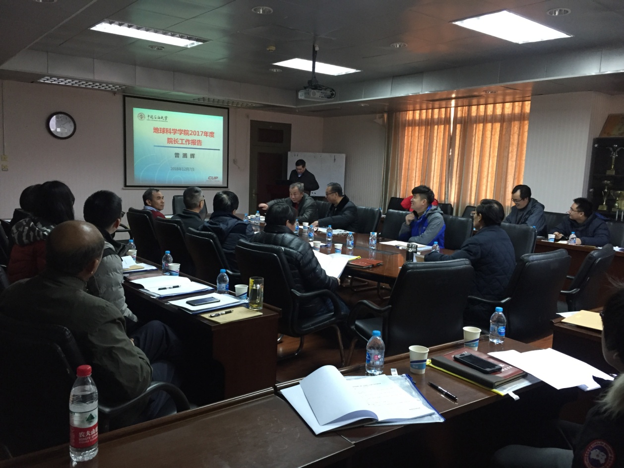 会上,地球科学学院院长曾溅辉教授作了2017年度学院工作总结,系统总结和归纳了2017年学院在学科建设、队伍建设、教学质量、科学研究、党团工作等方面的主要进展,同时也指出了学院发展中面临着的主要问题与不足。接着院工会主席余一欣副教授作了2017年工会工作和财务情况报告,院办主任王宣赫作了2017年度学院财务工作总结报告,党委书记王贵文教授作了地球科学学院工会换届选举说明,曾溅辉院长通报了学术不端行为处理结果。