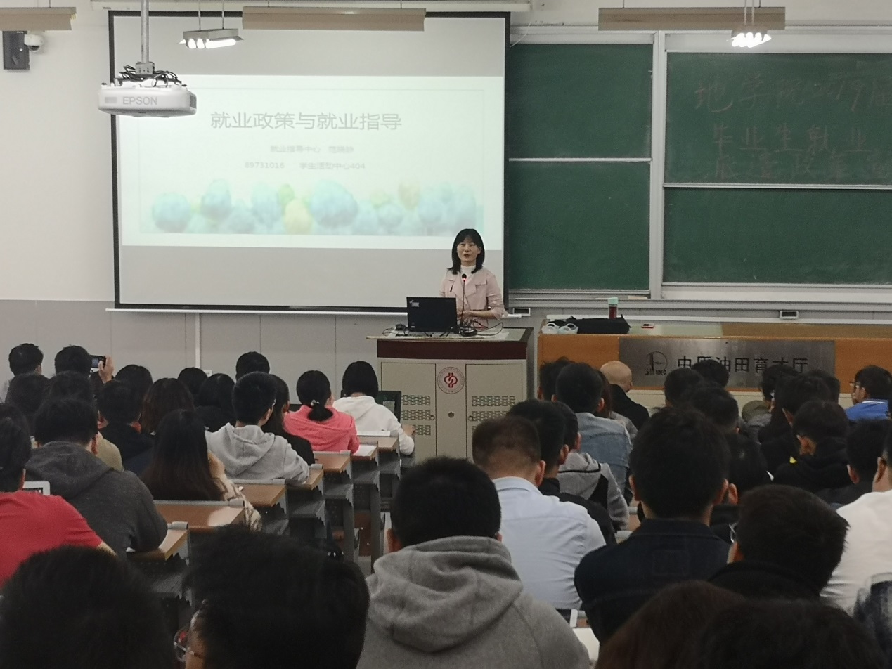 2019年4月25日上午,地球科学学院2019届毕业生就业派遣政策宣讲会在三教208召开,就业指导中心范晓静老师应邀为学生进行政策解读,地球科学学院团委书记费葳葳主持会议。