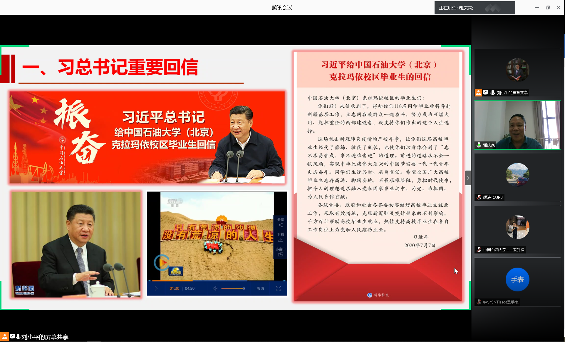 盆地与油藏研究中心主任李美俊带领大家再次重温了习近平总书记的重要回信,大家深刻感悟到习近平总书记的回信字字温暖亲切、句句催人奋进。谢庆宾院长结合自身在校区的工作经历,与大家分享了新疆维吾尔自治区党委向学校传达习近平总书记回信时的振奋而激动的场景,并从校区建设、学生生活学习状态、学校培养目标、教育方式、校企深度合作、新疆改革开放、国家“一带一路”政策以及当前国内与国际环境等多维视角,阐释了118名大学毕业生自愿留在新疆基层工作并自发地给总书记写信的动机和背景,进一步为大家深度解读了习近平总书记重要回信的深刻内涵和重大意义。