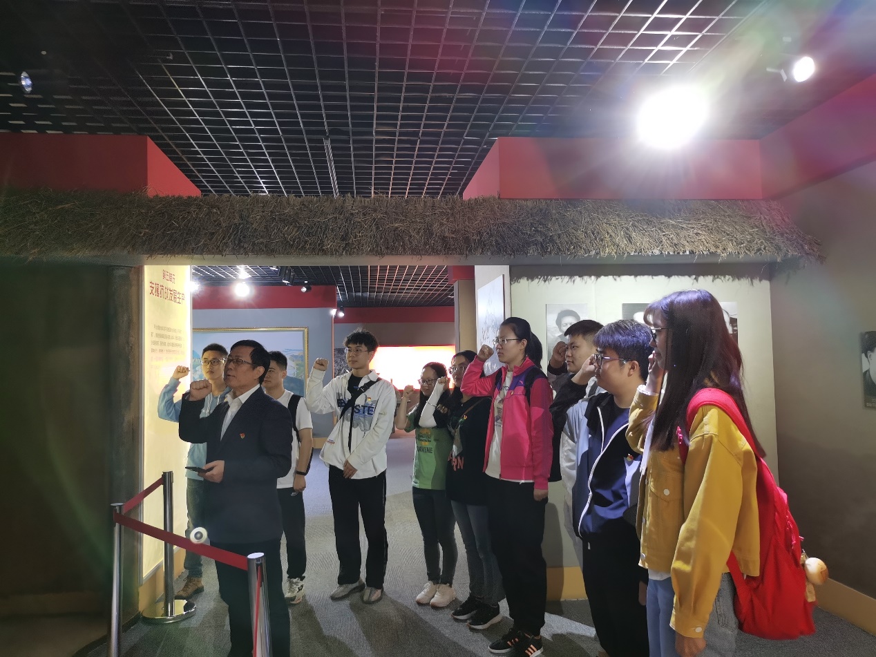 北京市延庆区大庄科乡沙塘沟村,这里是抗战时期平北地区第一个农村党支部的诞生地,被誉为“平北红色第一村”。“第一村”的纪念馆中共包含了七个单元,分别是:“平北抗战开辟”、“英勇抗击”、“僵持岁月”、“支援抗战发展生产”、 “壮大组织”、“走向胜利”、“革命遗址”。师生们在讲解员的带领下学习平北农村党支部建立的历史,了解从沙塘沟走出来的八路军战士背后的故事。一张张革命先烈的照片,一件件那个年代的作战工具、生活用品,午无一不在告诉大家几十年前这里曾经抗战的血雨腥风。师生们在高岗同志的带领下,怀着崇敬与激动的心情在纪念馆中“第一个党支部成立现场” 的塑像前重温入党誓词。
