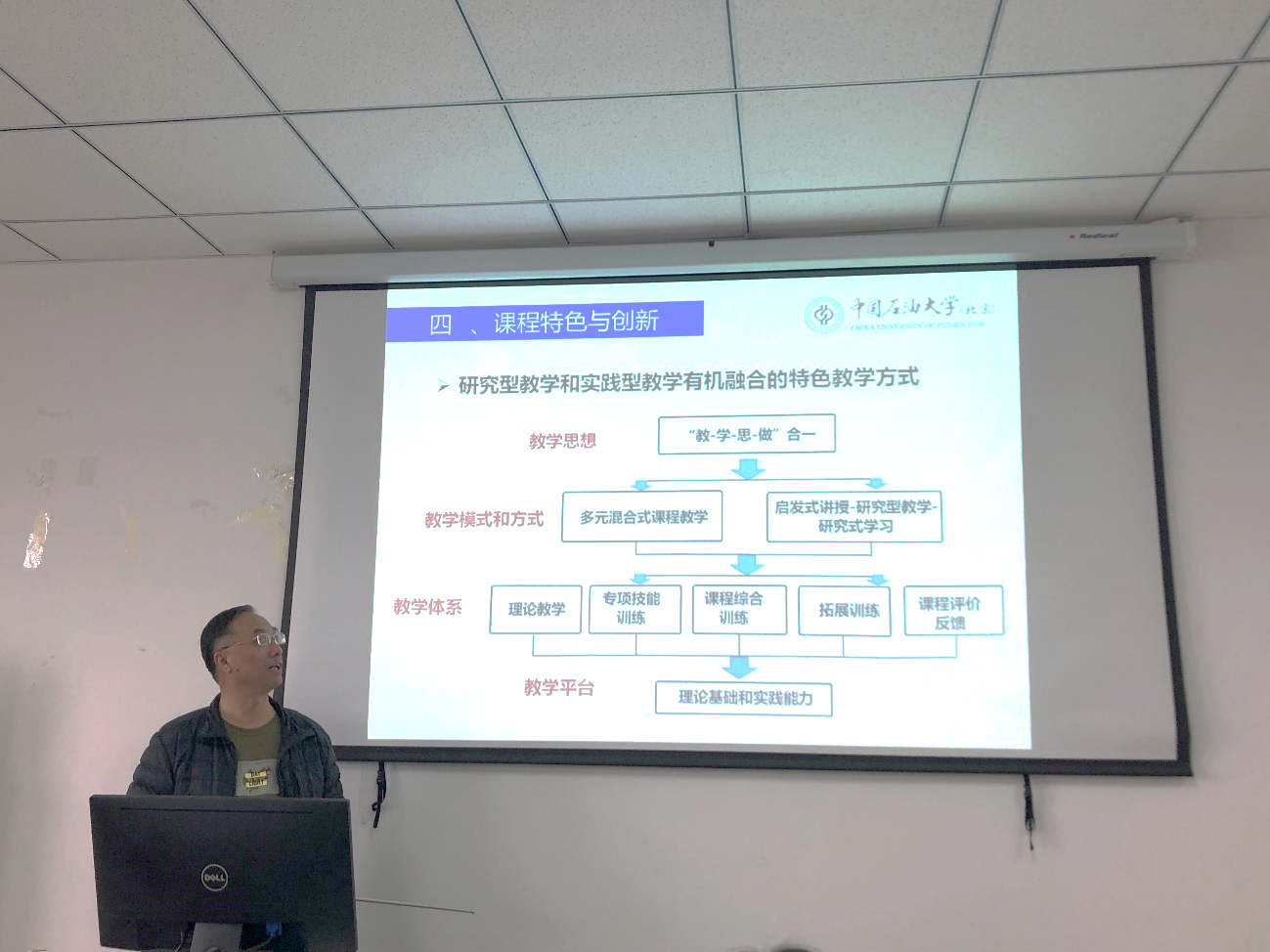 柳广弟教授长期主讲我校本科资源勘查工程专业的专业必修课程《石油地质学》,具有丰富的教学经验。柳教授认为,对于高校来说,课程建设是本科教育的关键。会上,柳教授首先认真解读了《教育部关于深化本科教育教学改革全面提高人才培养质量的意见》(教高〔2019〕6号)文件,着重学习了国家级一流课程和本科专业建设的“双万计划”的原则和要求,分析了国家级一流课程的推荐条件。他将高校建设一流课程的要素总结为五点:教学理念、教学目标、师资队伍、教学方法、教学资源。柳教授根据《石油地质学》申报国家级线下一流课程的相关事宜,从课程概况、课程目标与教学理念、课程建设与应用和课程特色与创新四个方面的内容,结合多年从教经验,同与会的各位老师探讨了国家级一流课程建设内容。