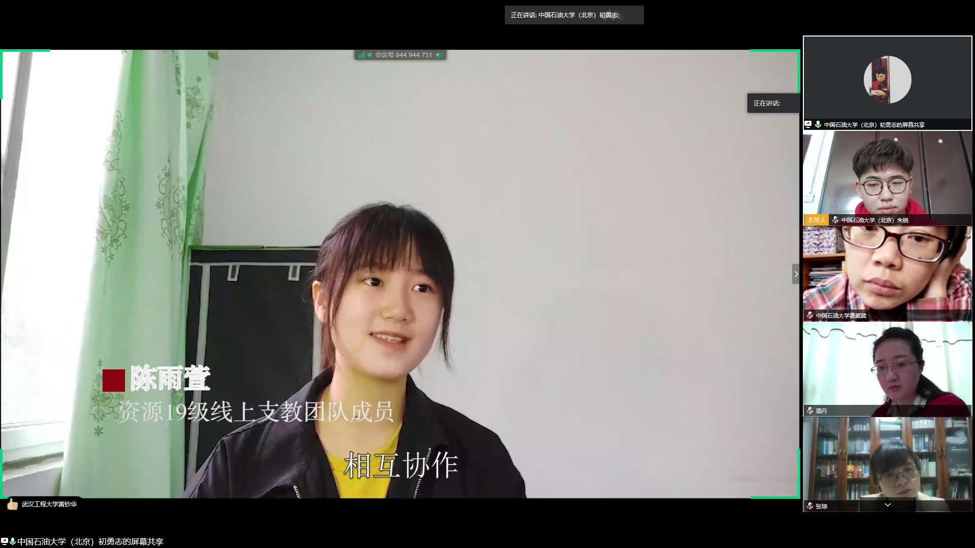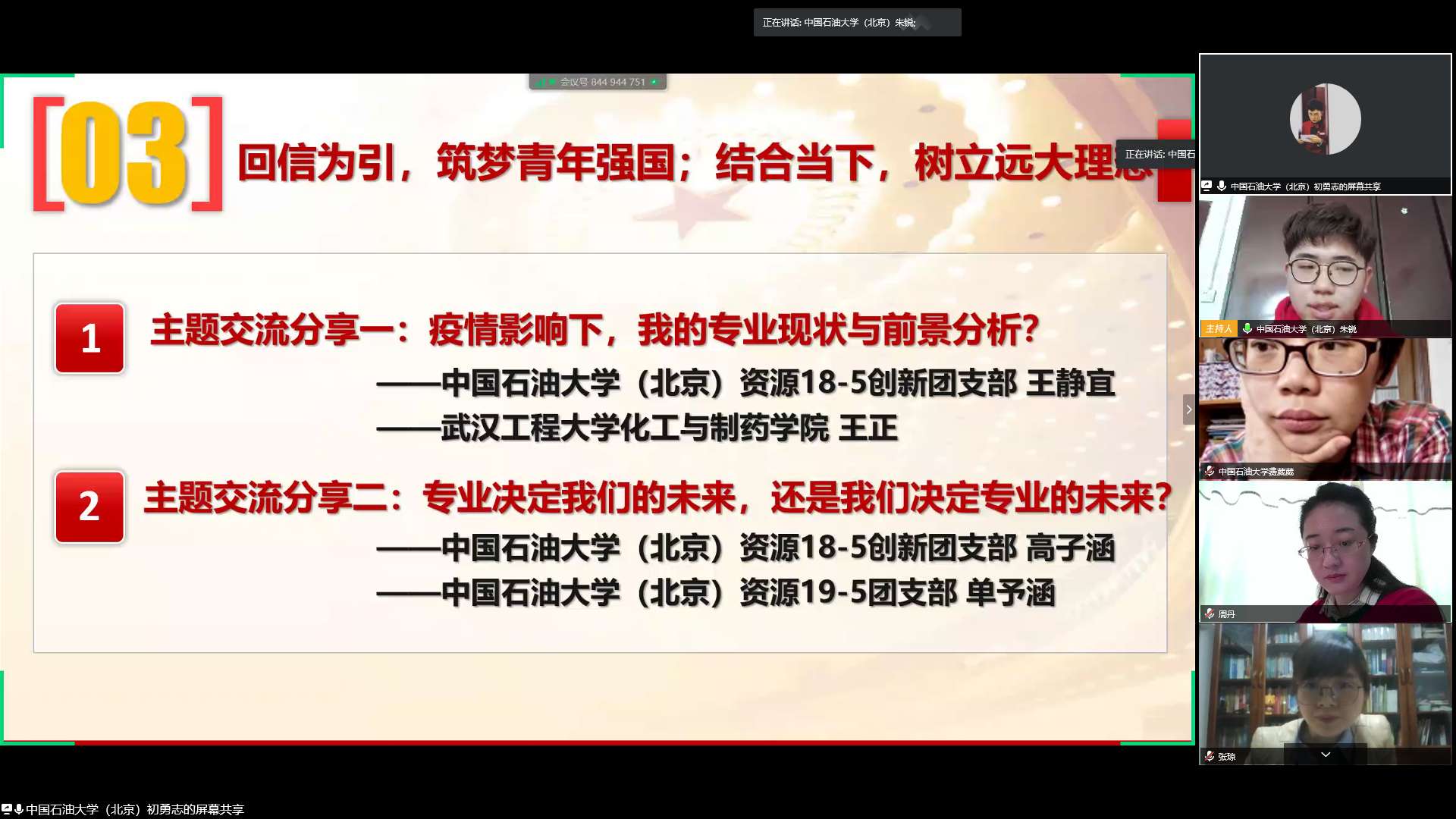 会上,武汉工程大学抗疫志愿者李睿媛分享了自己在武汉参加抗疫志愿活动的经历和感受,体现了一个普通90后学子在大难中的勇敢和担当。中国天天色天天(北京)地学院资源18-5与资源19级团支部分享了 “弘扬五老精神”、“彰显青春力量”、“石子绽放青春”和“盛开团结之花”四个主题的人物采访事迹。在学习先进事迹之后,两校学生以自己所学的专业在抗疫斗争中所承担的重要使命为切入点,讲述了自己对于专业的认识和未来择业就业的畅想,并呼吁同学们心怀远大抱负,学好专业知识,立志为专业发展、为祖国未来而奋斗。