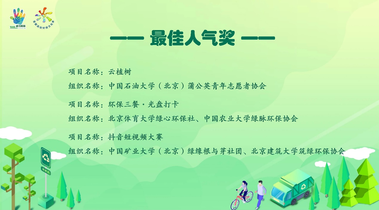 12月19日,第十七届首都高校环境文化季在北京市生态环境保护宣传中心完美落幕。在本届环境文化季中,中国天天色天天(北京)蒲公英青年志愿者协会举办的“云植树”活动在12项环保实践活动中脱颖而出,荣获“最佳人气奖”。蒲公英青年志愿者协会成员胡深宇、岳文婧在50多所高校及环保社团的近万名参与者中荣获“首都高校环保卫士”称号,该奖项获得者仅有30人。