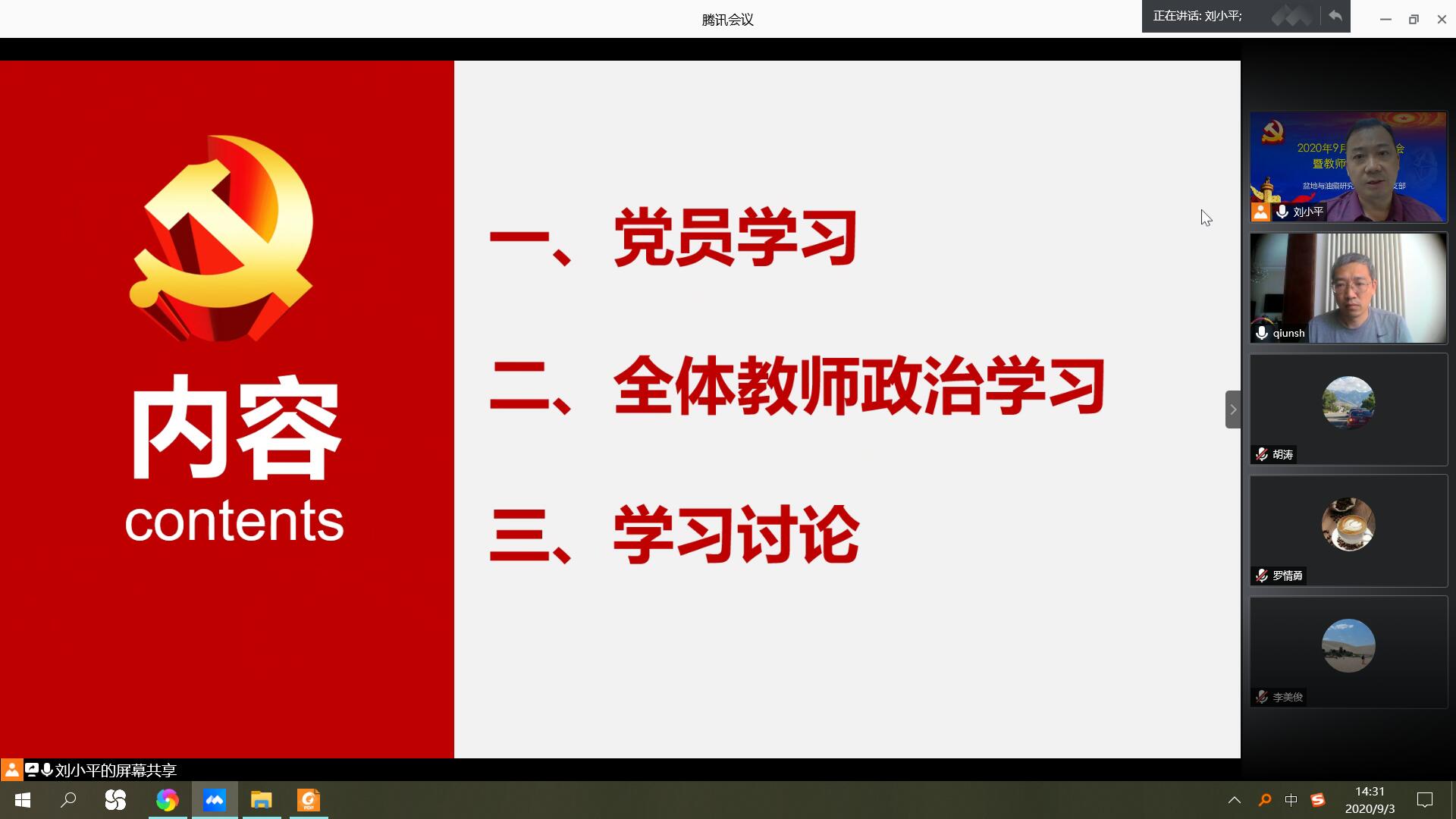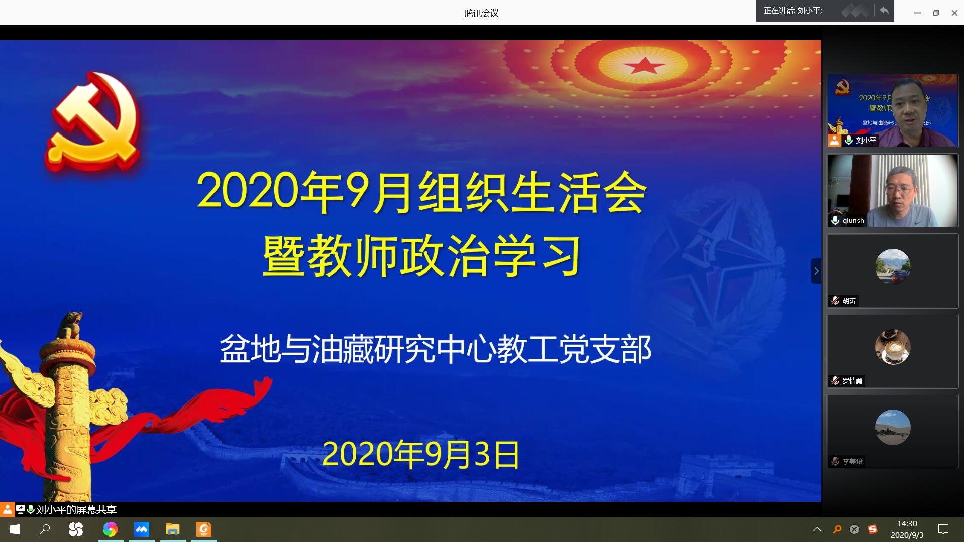 9月3日下午,遵照校党委统一部署,地球科学学院盆地与油藏研究中心教工党支部组织召开党员组织生活暨全体教师政治学习讨论会,就“习近平总书记关于‘四史’及新冠肺炎疫情防控的重要论述”、“《中国共产党的九十年》、《简明中国历史读本》以及《抗击新冠肺炎疫情的中国行动》等著作和资料”以及“师德师风建设”开展线上学习与讨论,会议由党支部书记刘小平主持。