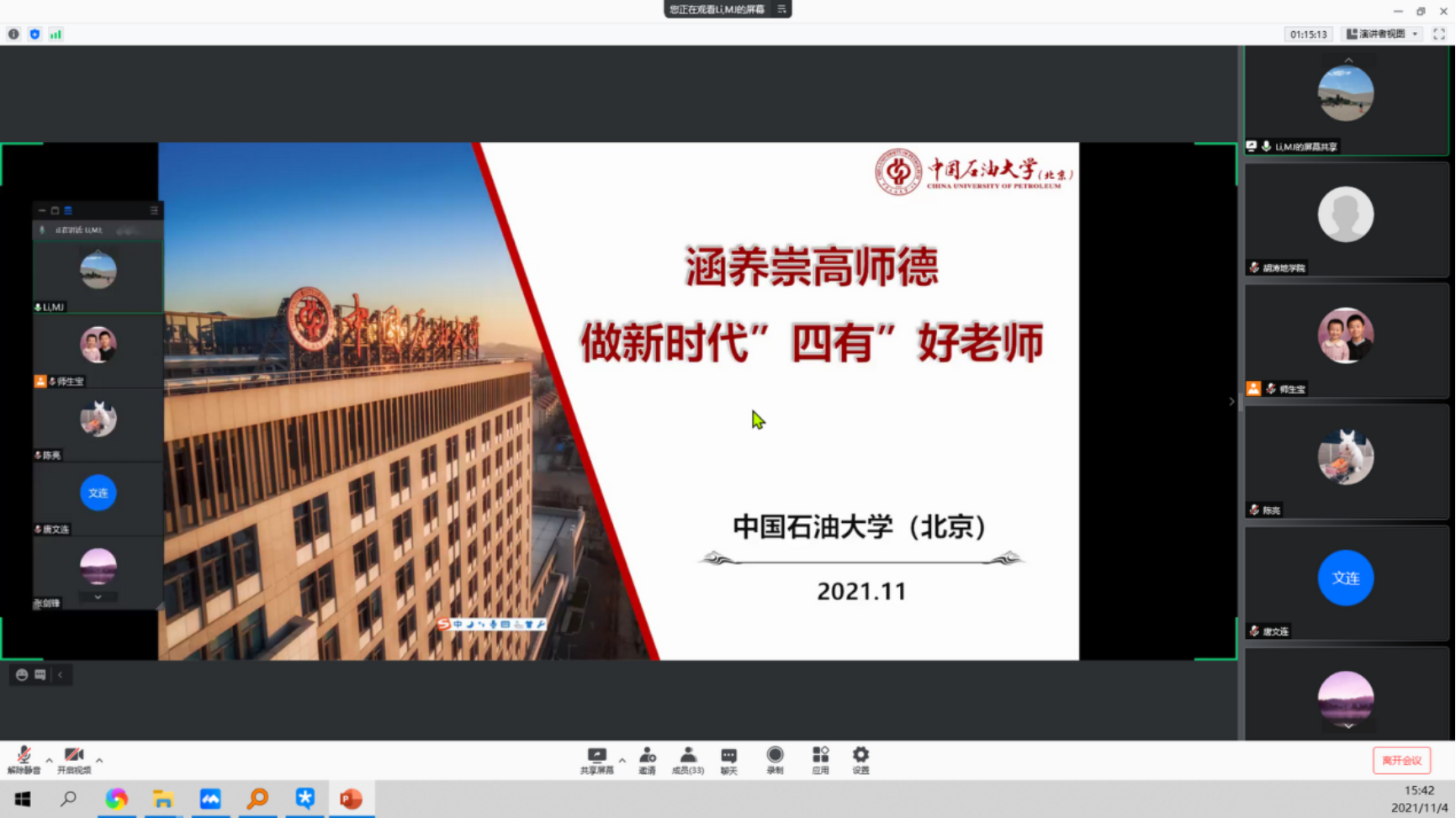2021年11月4日下午,盆地与油藏研究中心教工党支部组织全体教职工线上进行了党员和教师理论学习,共有35位党员和教职工参加了本次学习和研讨,会议由李美俊同志主持,会议共分为三个阶段。