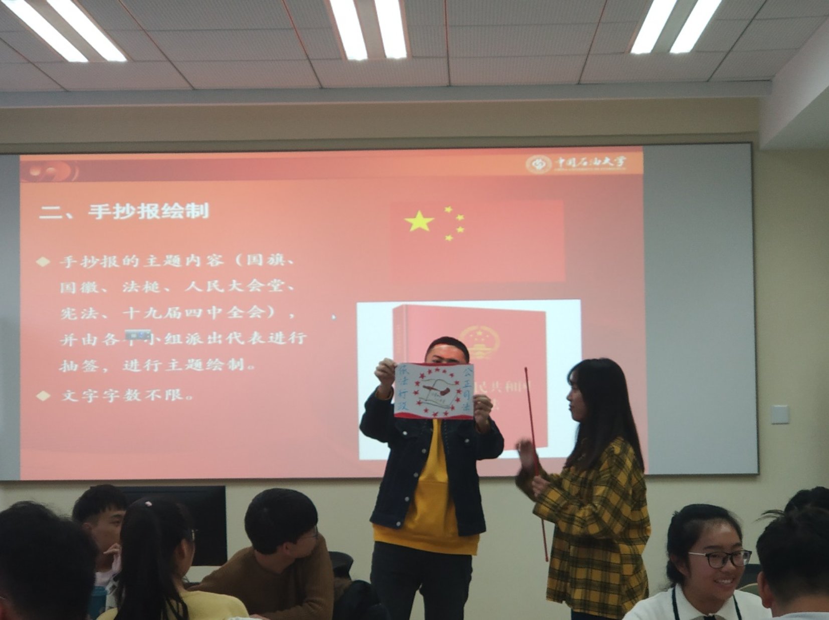 地研19-2班和地研19-8班共同展开主题宣传活动,通过手抄报绘制与讲解的形似来推动学生更好地深入学习宣传宪法,弘扬宪法精神,维护宪法权威。通过普法主题绘制,让普法宣传更加有趣,有利于对宪法精神的弘扬,宪法权威的维护,让宪法更加深入同学们的心中。
