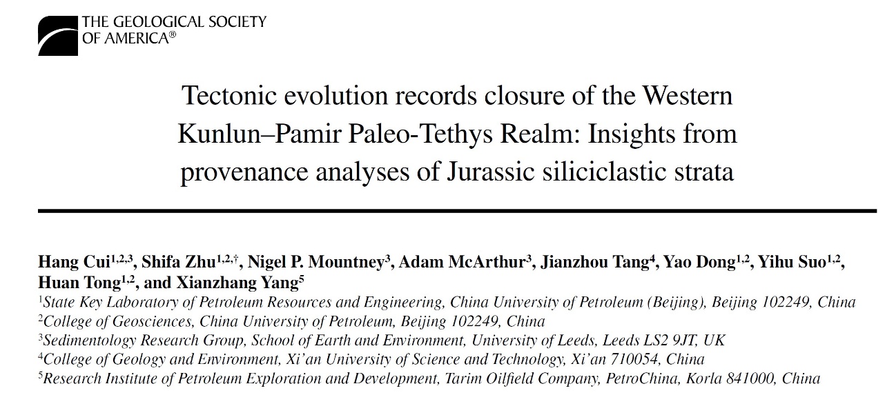 该成果与英国利兹大学Nigel Mountney教授和Adam McArthur博士以及塔里木油田合作完成,成果论文《Tectonic evolution records closure of the Western Kunlun–Pamir Paleo-Tethys Realm: Insights from provenance analyses of Jurassic siliciclastic strata》发表在地学领域著名期刊《GSA Bulletin》上。论文第一作者为我院博士生崔航,通讯作者为朱世发教授,中国天天色天天(北京)油气资源与工程全国重点实验室和地球科学学院为第一完成单位。《GSA Bulletin》是地球科学领域的中科院1区top和JCR Q1期刊,具有重要的学术影响力,五年平均影响因子为4.4。