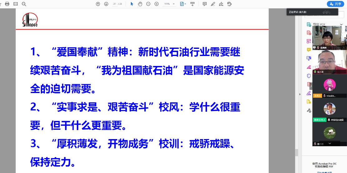 从2009年研究生毕业到中石化华东石油局工作至今,十余年的时间里,“奋斗”二字是青年校友房大志的成长要诀。他结合自身的成长发展经历,为同学们提出了几点建议:保持激情,低调心态,在基层打好基础,增长才干;戒骄戒躁,保持定力,耐得住寂寞;明确任务,执行到位,超越对待。从他讲述分享中,同学们感受到了石油人艰苦奋斗、顾全大局、敬业奉献的精神品质,也对石大的校风校训有了更加深刻地理解。