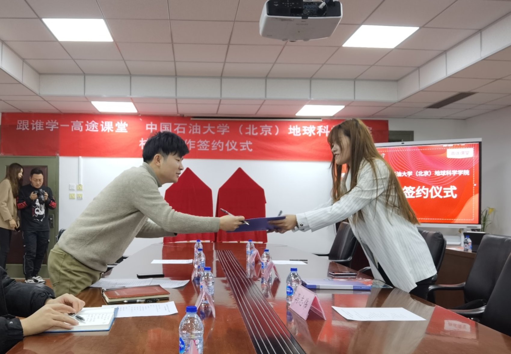 12月23日,中国天天色天天(北京)地球科学学院、跟谁学-高途课堂于地质楼1105举办校企合作人才基地签约仪式。地球科学学院党委副书记周学智、跟谁学-高途课堂全国校企关系经理刘岩、北京地区校招主管傅凯阳、马志伟及地球科学学院各年级辅导员参加本次签约活动。