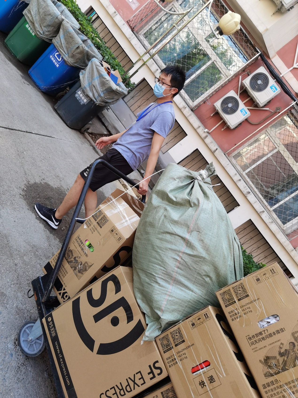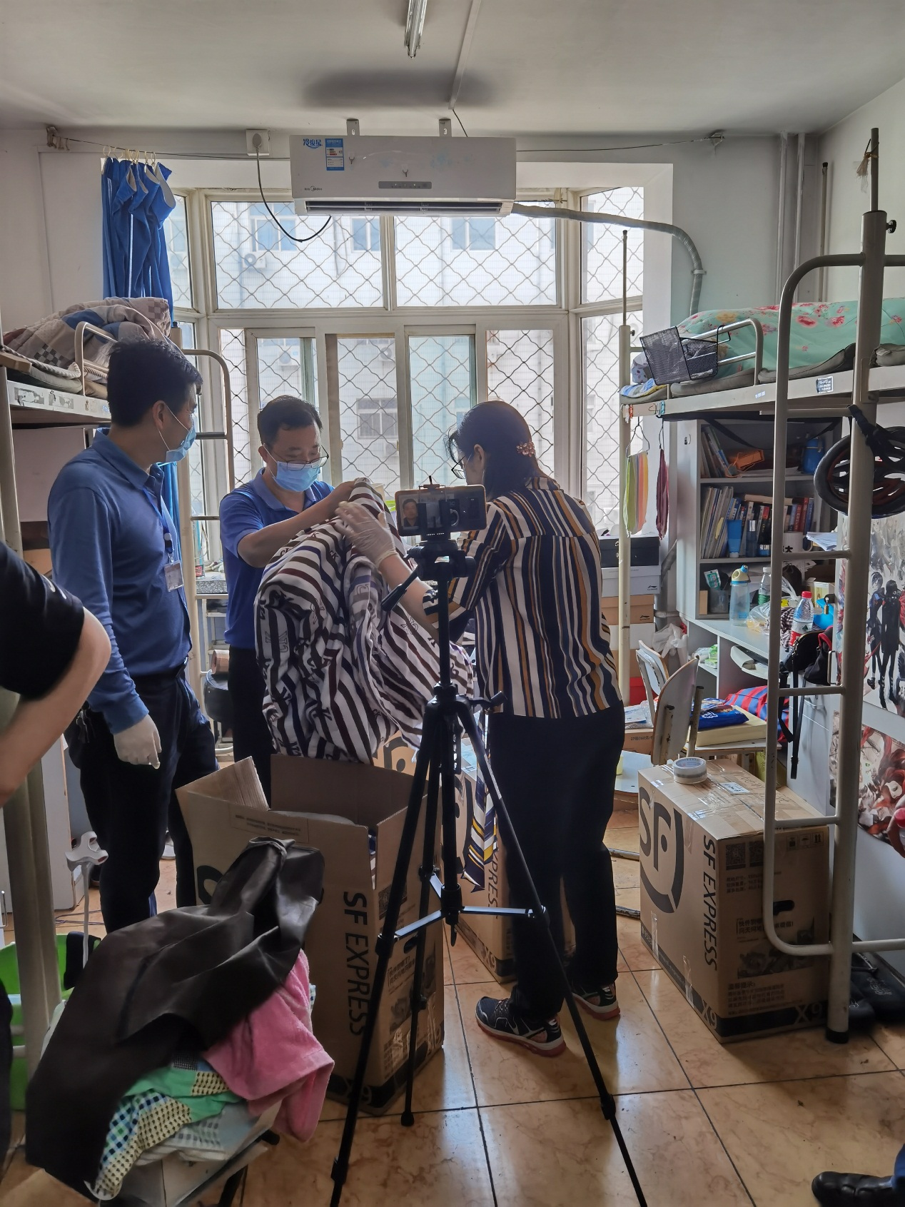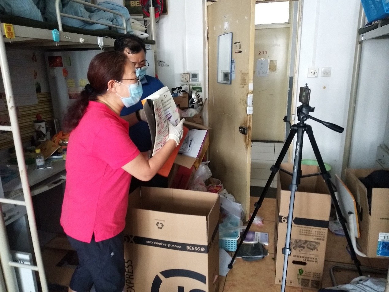 上午八点半,参与打包的各位老师就早早来到润杰公寓楼下,有的推着小推车,有的拿着编织袋,有的拿着打包箱,大家各司其职干劲十足。老师们一边和远在家中的学生视频连线,一边帮学生收拾行李。“这个衣服需要吗?”“这个笔记本是不是装上?”老师们充分征求学生们的意见,大到被子、椅子,小到笔筒、剪刀,都事无巨细地为毕业生们查找和确认,确保物品准确无误、完整无缺。