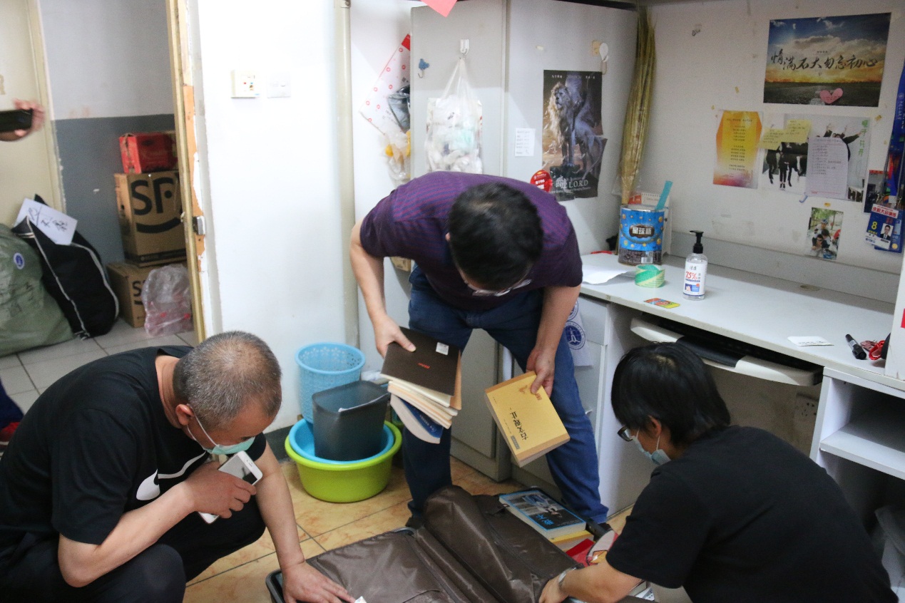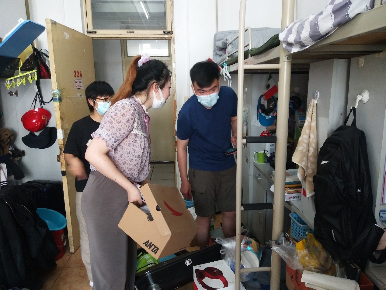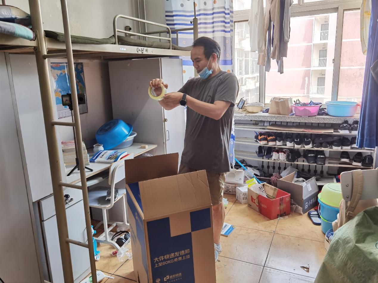 打包完成后,老师们细心地在行李上写上了学生们的姓名和住址,避免在运送的过程中出现差错。宿舍内空间较为狭小,天气较为炎热,行李打包起来也格外费时费力,没一会儿老师们已经汗流浃背了。