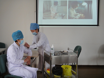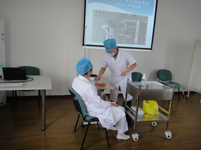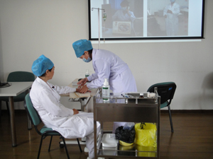 活动中,石大的白衣天使们先后展示了静脉穿刺、肌肉注射、伤口换药、测量血压四项基本护理技能。每一位展示人员都严格执行“无菌”和“三查七对”的护理原则,展示了扎实的基本功和医护工作者的爱心。