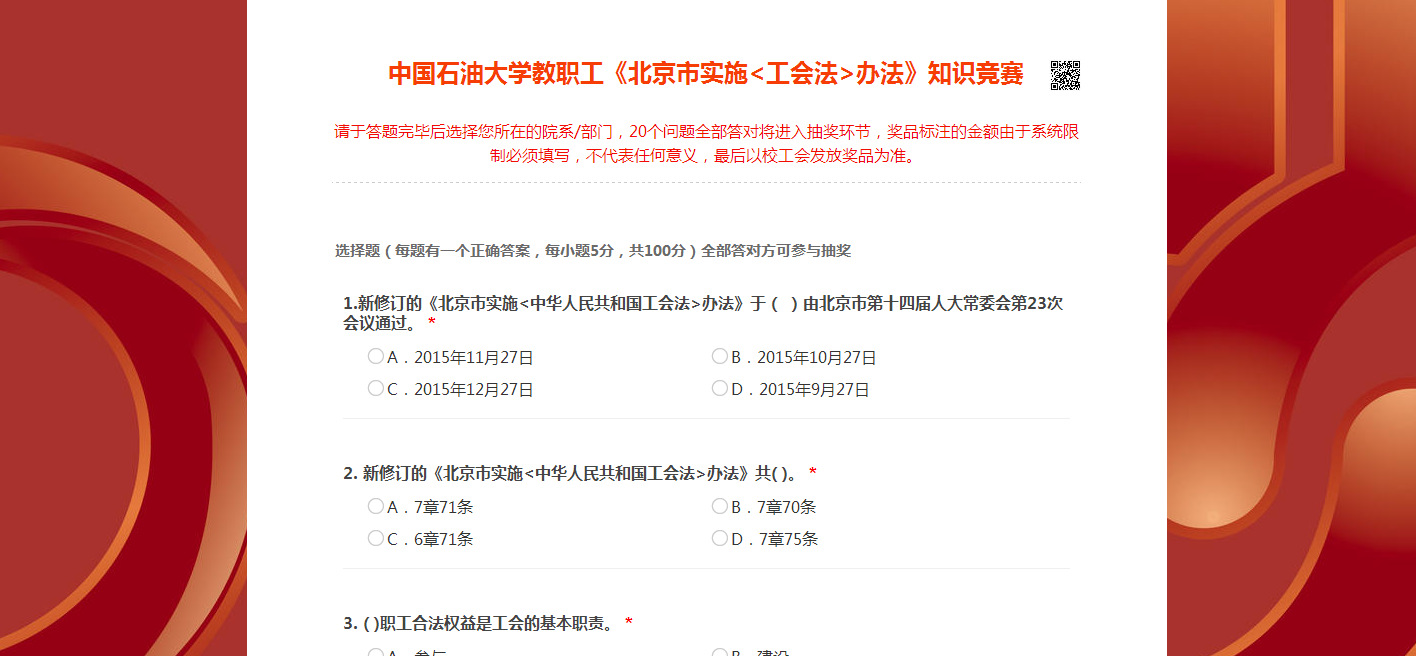 此次在线答题活动以北京市第十四届人民代表大会常务委员会第二十三次会议修订《北京市实施<中华人民共和国工会法>办法》为背景,于9月2日至9月14日在校工会制作的线上答题平台上进行。答题活动吸引广大教职工积极参与,共有500余名教职工参与答题,为提高答题活动质量,校工会在活动前组织工会主席动员会,对《北京市实施<中华人民共和国工会法>办法》进行了专题宣讲和培训,同时为提高广大教职工参与答题的热情,校工会通过答题系统随机抽取了部分优质答卷进行奖励。
