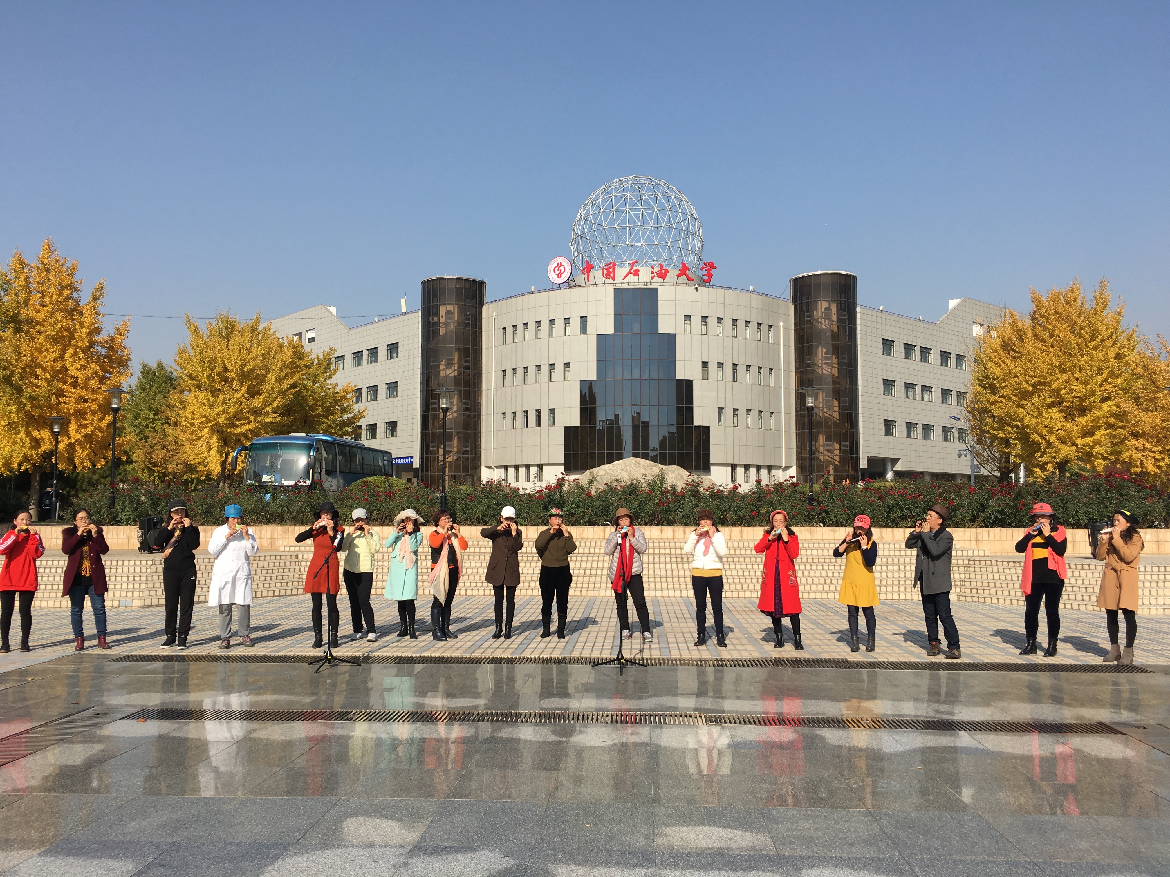 美丽的深秋时节,在温暖的阳光下,金灿灿的银杏叶和火红的枫叶把天天色天天的校园装扮得格外动人。11月2日中午,石大教工陶笛协会、石大陶笛社以及全校爱好陶笛的乐友们到北校区喷泉广场进行了一场令人振奋的快闪表演。