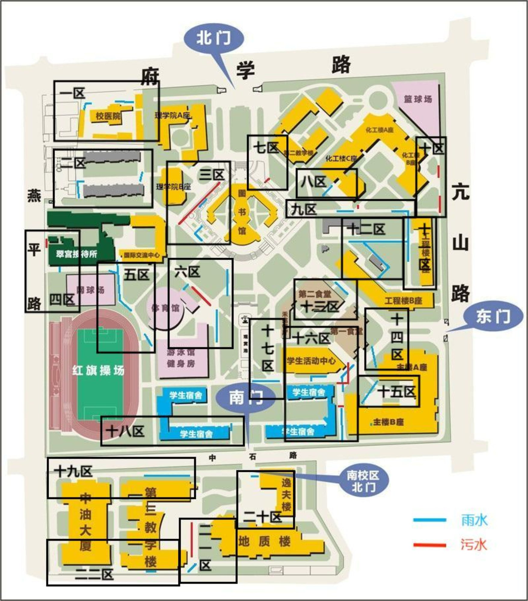 学校现有部分排水管道老化,已丧失排水能力,南北校园部分雨污水管道错接、混接,造成雨污合流,致使污水管网、污水处理厂压力增大,造成极大的资源浪费。
