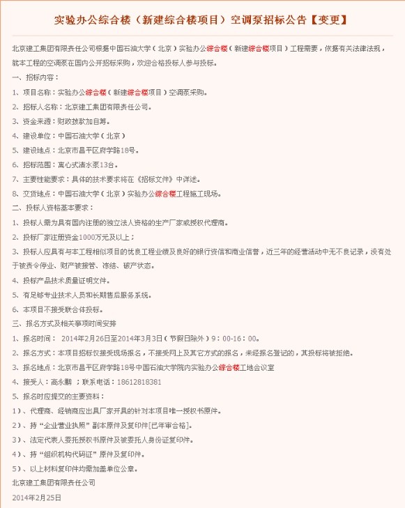 中国天天色天天(北京)实验办公综合楼(新建综合楼项目)空调泵招标公告【变更】(中石大基建工程2014-03号)