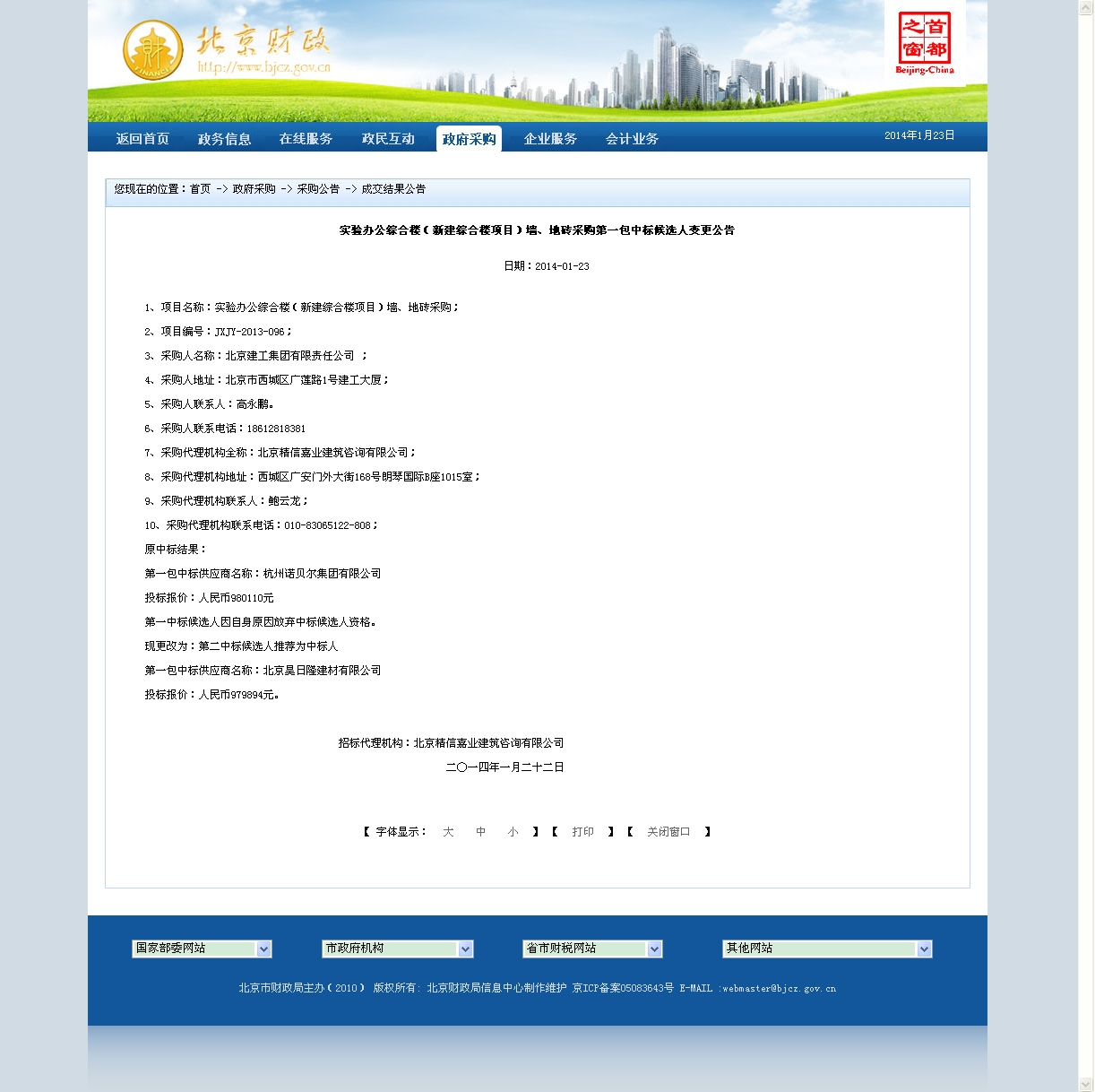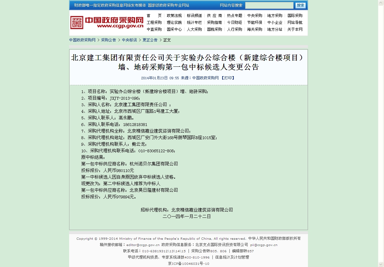 北京市财政局中国天天色天天(北京)实验办公综合楼(新建综合楼项目)墙地砖采购中标候选人变更公告