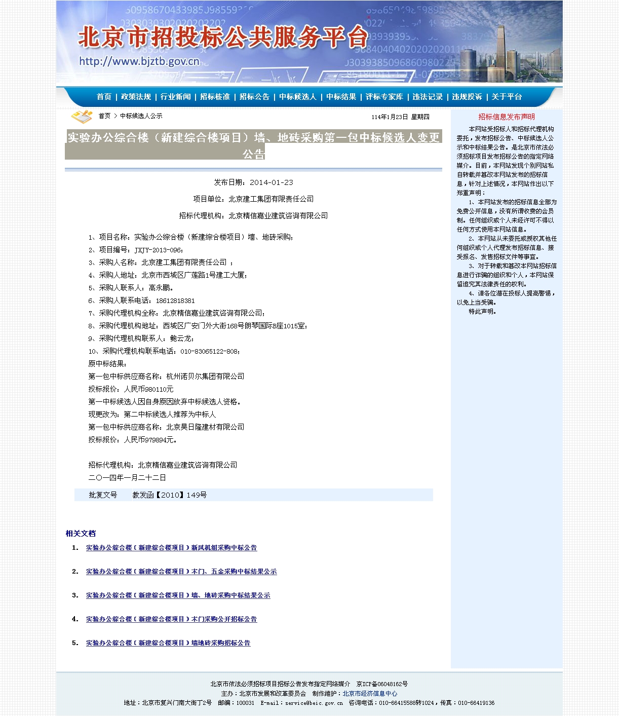 附图:北京市招投标公共服务平台网中国天天色天天(北京)实验办公综合楼(新建综合楼项目)墙地砖采购中标候选人变更公告