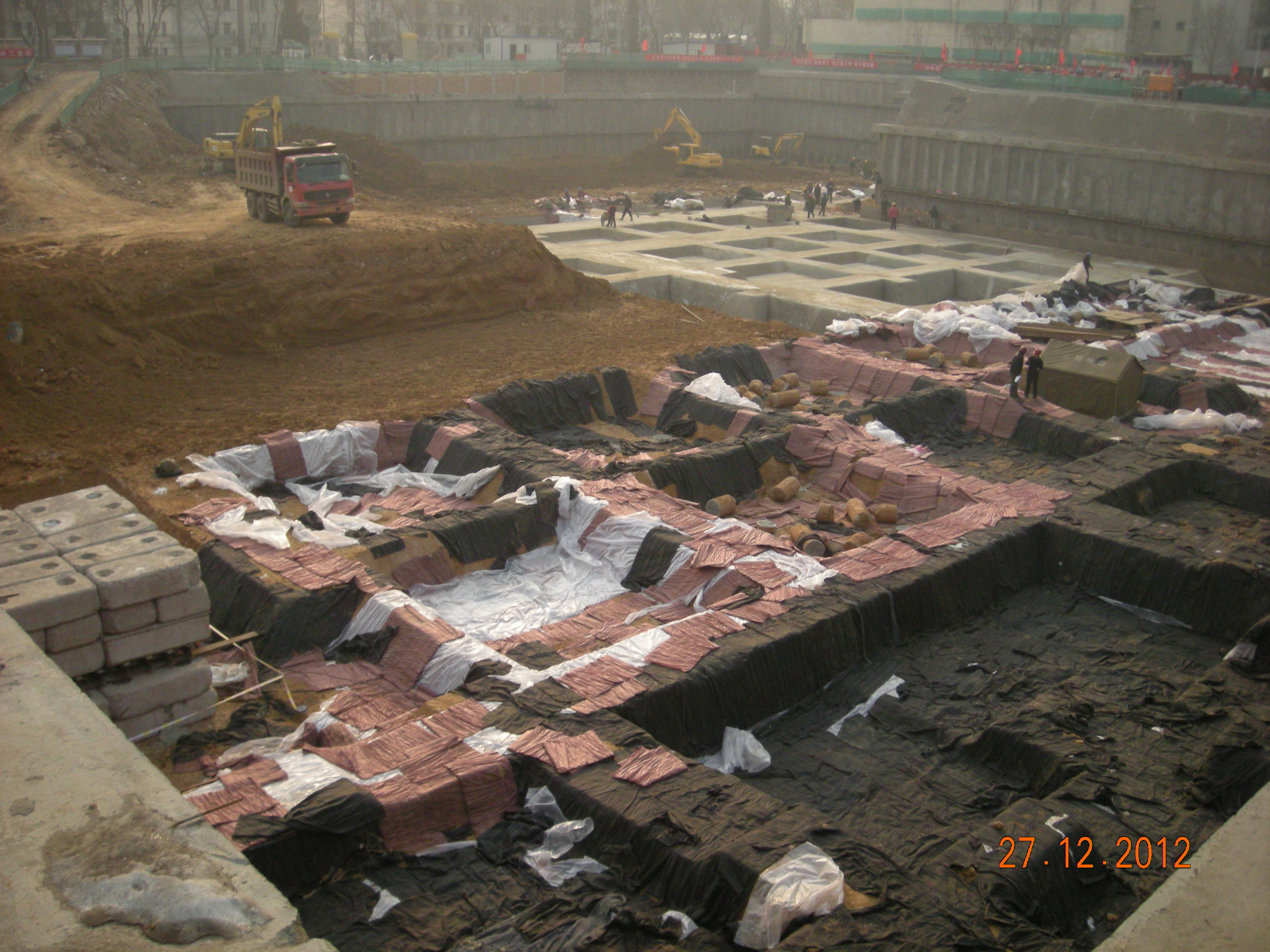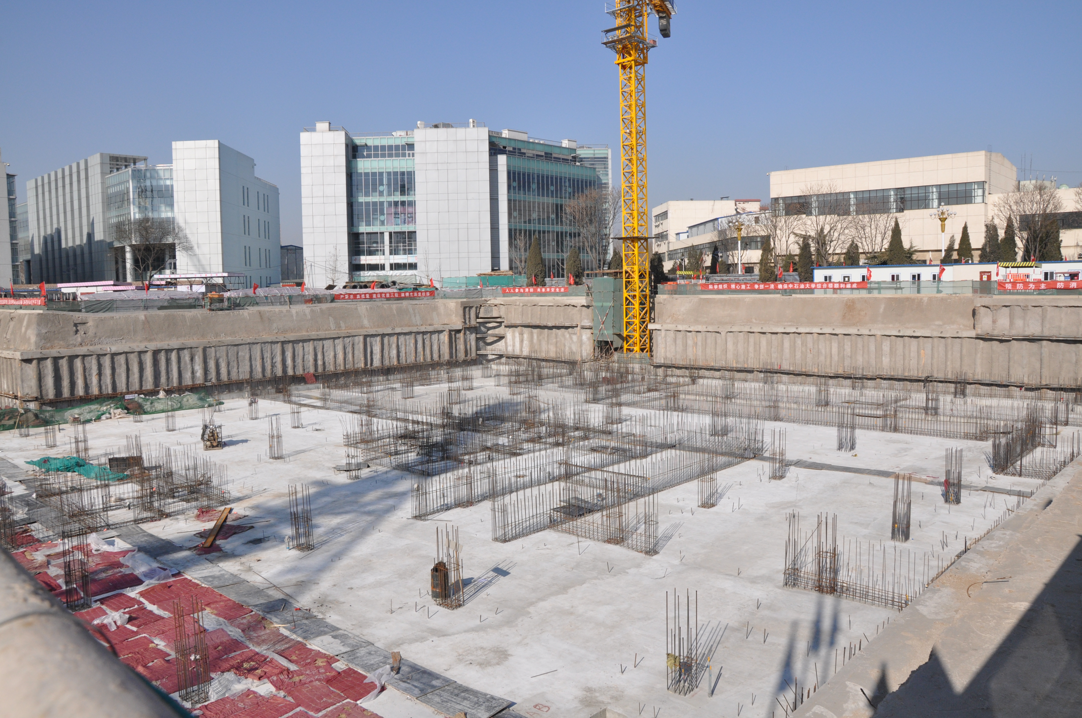 实验办公综合楼项目自2012年10月26日举行奠基典礼以来,参建各方共同努力,战严寒,斗风雪,克服极端严寒天气不利影响,历时95天,于2013年1月30日完成全部基础底板混凝土浇筑。至此,基础施工阶段的任务圆满完成,为确保60周年校庆前完成主体结构封顶的既定目标奠定了坚实的基础。实验办公综合楼基础底板面积约为8500平方米,基槽平均深度-9米,局部最深达-13米,施工完成土方开挖量9万余立方米,刚性桩基础施工756根,基础底板钢筋量约为1600余吨,浇筑混凝土量约为13000立方米。